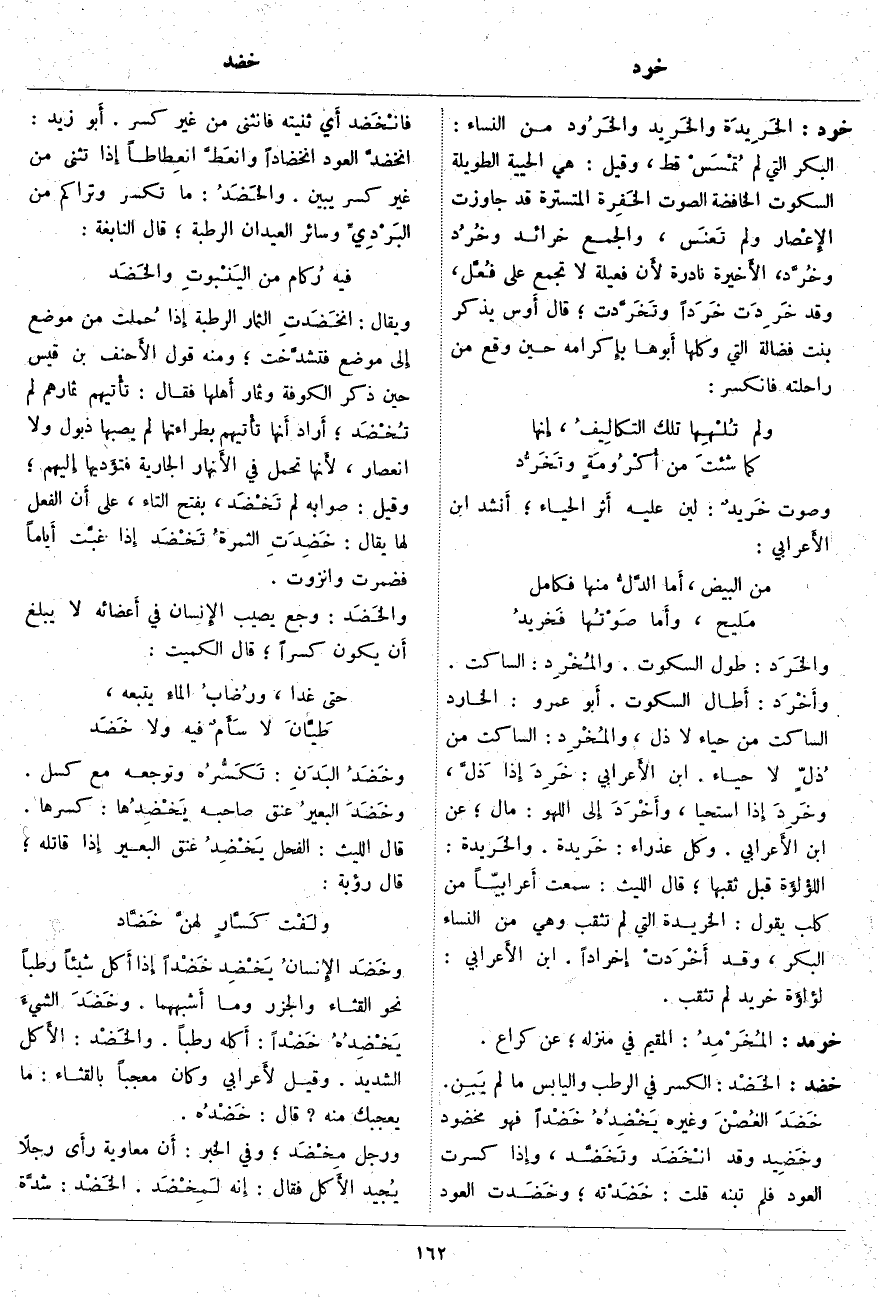 خرد: الخَرِيدَة والخَرِيد والخَرُود مِنَ النِّسَاءِ: الْبِكْرُ الَّتِي لَمْ تُمْسَسْ قَطُّ، وَقِيلَ: هِيَ الْحَيِيَّةُ الطَّوِيلَةُ السُّكُوتِ الْخَافِضَةُ الصَّوْتِ الخَفِرة الْمُتَسَتِّرَةُ قَدْ جَاوَزَتِ الإِعْصار وَلَمْ تَعنَس، وَالْجَمْعُ خَرَائِدُ وخُرُد وخُرَّد، الأَخيرة نَادِرَةٌ لأَن فَعِيلَةَ لَا تُجْمَعُ عَلَى فُعَّل، وَقَدْ خَرِدَت خَرَداً وتَخَرَّدت؛ قَالَ أَوس يَذْكُرُ بِنْتَ فَضَالَةَ الَّتِي وَكَّلَهَا أَبوها بإِكرامه حِينَ وَقَعَ مِنْ رَاحِلَتِهِ فَانْكَسَرَ: