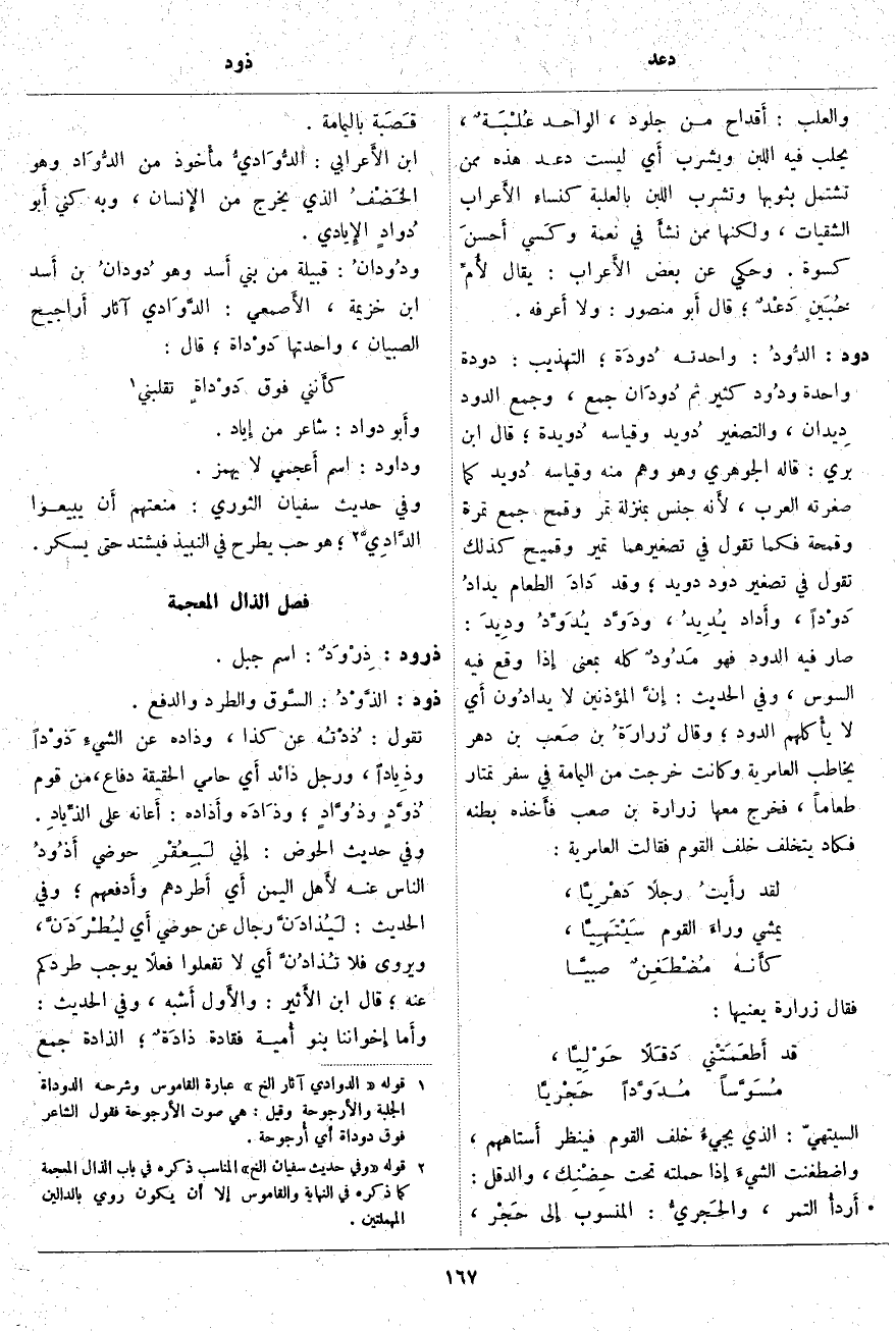 دَوَدَ: الدُّودُ: وَاحِدَتُهُ دُودَة، التَّهْذِيبُ: دُودَةٌ وَاحِدَةٌ ودُود كَثِيرٌ ثُمَّ دُودَان جَمْعٌ، وَجَمْعُ الدُّودِ دِيدان، وَالتَّصْغِيرُ دُويد وَقِيَاسُهُ دُويدة، قَالَ ابْنُ بَرِّيٍّ: قَالَهُ الْجَوْهَرِيُّ وَهُوَ وَهْمٌ مِنْهُ وَقِيَاسُهُ دُويد كَمَا صَغَّرَتْهُ الْعَرَبُ، لأَنه جِنْسٌ بِمَنْزِلَةِ تَمْرٍ وَقَمْحٍ جَمْعُ تَمْرَةٍ وَقَمْحَةٍ فَكَمَا تَقُولُ فِي تَصْغِيرِهِمَا تُمَيْرٌ وَقُمَيْحٌ كَذَلِكَ تَقُولُ فِي تَصْغِيرِ دُودٍ دُوَيْدٌ، وَقَدْ دَادَ الطَّعَامُ يدادُ دَوْداً، وأَداد يُدِيدُ، ودَوَّد يُدَوِّدُ ودِيدَ: صَارَ فِيهِ الدُّودُ فَهُوَ مَدُودٌ كُلُّهُ بِمَعْنَى إِذا وَقَعَ فِيهِ السُّوسُ، وَفِي الْحَدِيثِ: