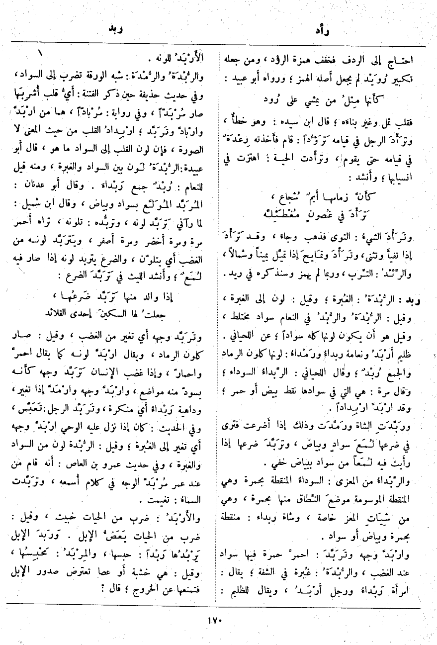 ، هُمَا مِنَ ارْبَدَّ وارْبادَّ وتَرَبَّد؛ ارْبِدادُ الْقَلْبِ مِنْ حَيْثُ الْمَعْنَى لَا الصُّورَةُ، فإِن لَوْنَ الْقَلْبِ إِلى السَّوَادِ مَا هُوَ، قَالَ أَبو عُبَيْدَةَ: الرُّبْدَةُ لَون بَيْنَ السَّوَادِ وَالْغُبْرَةِ، وَمِنْهُ قِيلَ لِلنَّعَامِ: رُبْدٌ جَمْعُ رَبْداءَ. وَقَالَ أَبو عَدْنَانَ: المُرَبَّد المُوَلَّع بِسَوَادٍ وَبَيَاضٍ، وَقَالَ ابْنُ شُمَيْلٍ: لَمَّا رَآنِي تَرَبَّد لَوْنُهُ، وتربُّده: تَلَوُّنُهُ، تَرَاهُ أَحمر مَرَّةً وَمَرَّةً أَخضر وَمَرَّةً أَصفر، ويَترَبَّد لَوْنُهُ مِنَ الْغَضَبِ أَي يَتَلَوَّنُ، وَالضَّرْعُ يَتَرَبَّدُ لَوْنُهُ إِذا صَارَ فِيهِ لُمَعٌ؛ وأَنشد اللَّيْثُ فِي تَرَبَّدَ الضَّرْعُ: