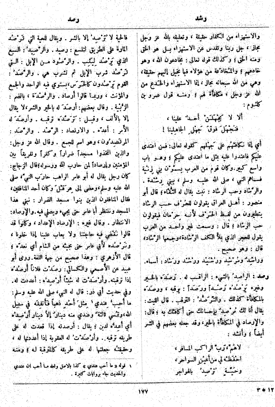 رصد: الراصِدُ بِالشَّيْءِ: الرَّاقِبُ لَهُ. رَصَدَه بِالْخَيْرِ وَغَيْرِهِ يَرْصُدُه رَصْداً ورَصَداً: يَرْقُبُهُ، ورصَدَه بالمكافأَة كَذَلِكَ. والتَّرَصُّدُ: التَّرَقُّبُ. قَالَ اللَّيْثُ: يُقَالُ أَنا لَكَ مُرْصِدٌ بإِحسانك حَتَّى أُكافئك بِهِ؛ قَالَ: والإِرصاد فِي المكافأَة بِالْخَيْرِ، وَقَدْ جَعَلَهُ بَعْضُهُمْ فِي الشَّرِّ أَيضاً؛ وأَنشد: