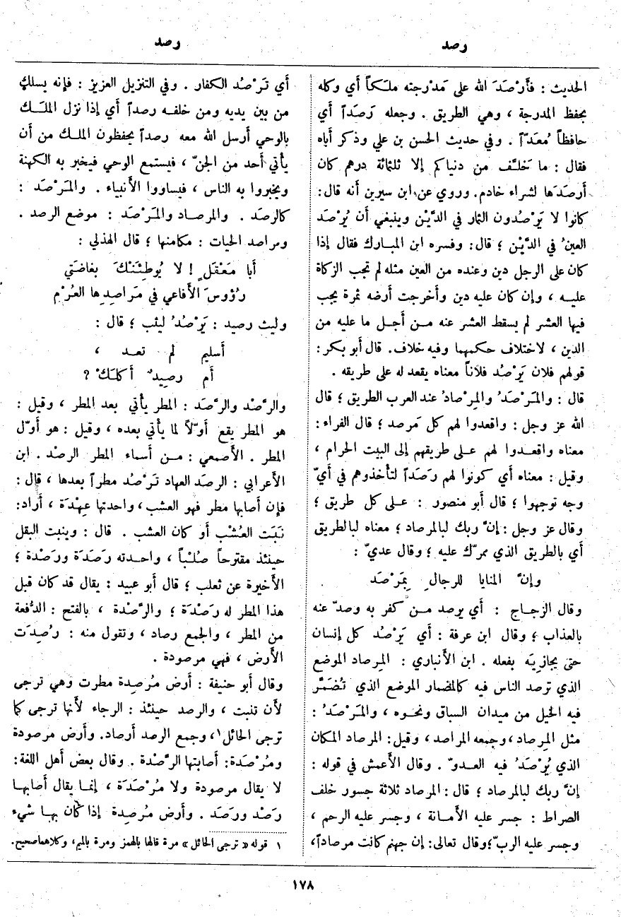 ؛ قَالَ: وَفَسَّرَهُ ابْنُ الْمُبَارَكِ فَقَالَ إِذا كَانَ عَلَى الرَّجُلِ دَيْنٌ وَعِنْدَهُ مِنَ الْعَيْنِ مِثْلُهُ لَمْ تَجِبِ الزَّكَاةُ عَلَيْهِ، وإِن كَانَ عَلَيْهِ دَيْنٌ وأَخرجت أَرضه ثَمَرَةً يَجِبُ فِيهَا الْعُشْرُ لَمْ يَسْقُطُ الْعُشْرُ عَنْهُ مِنْ أَجل مَا عَلَيْهِ مِنَ الدَّيْنِ، لِاخْتِلَافِ حُكْمِهِمَا وَفِيهِ خِلَافٌ. قَالَ أَبو بَكْرٍ: قَوْلُهُمْ فُلَانٌ يَرْصُد فُلَانًا مَعْنَاهُ يَقْعُدُ لَهُ عَلَى طَرِيقِهِ. قَالَ: والمَرْصَدُ والمِرْصادُ عِنْدَ الْعَرَبِ الطَّرِيقُ؛ قَالَ اللَّهُ عَزَّ وَجَلَّ: وَاقْعُدُوا لَهُمْ كُلَّ مَرْصَدٍ