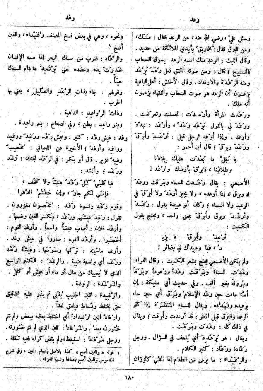الأَصمعي: يُقَالُ رَعَدت السَّمَاءُ وبَرَقت ورعَدَ لَهُ وَبَرَقَ لَهُ إِذا أَوعده، وَلَا يُجِيزُ أَرعَدَ وَلَا أَبرَقَ فِي الْوَعِيدِ وَلَا السَّمَاءِ؛ وَكَانَ أَبو عُبَيْدَةَ يَقُولُ: رَعَدَ وأَرعَدَ وَبَرَقَ وأَبرَقَ بِمَعْنًى وَاحِدٍ، وَيَحْتَجُّ بِقَوْلُ الْكُمَيْتِ: