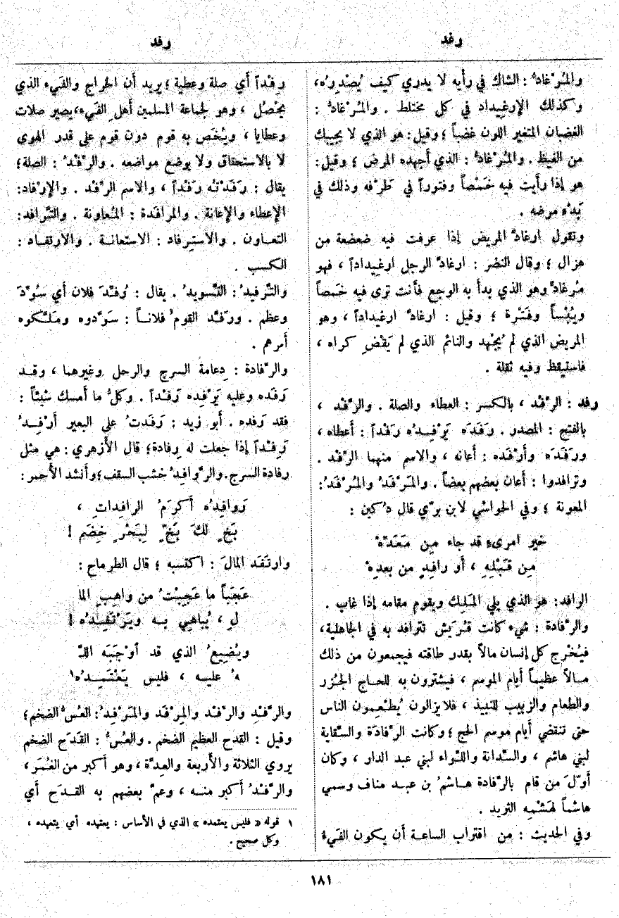 رفد: الرِّفْد، بِالْكَسْرِ: الْعَطَاءُ وَالصِّلَةُ. والرَّفْد، بِالْفَتْحِ: الْمَصْدَرُ. رَفَدَه يَرْفِدُه رَفْداً: أَعطاه، ورَفَدَه وأَرْفَده: أَعانه، وَالِاسْمُ مِنْهُمَا الرِّفْد. وَتَرَافَدُوا: أَعان بَعْضُهُمْ بَعْضًا. والمَرْفَدُ والمُرْفَدُ: الْمَعُونَةُ؛ وَفِي الْحَوَاشِي لِابْنِ بَرِّيٍّ قَالَ دُكين: