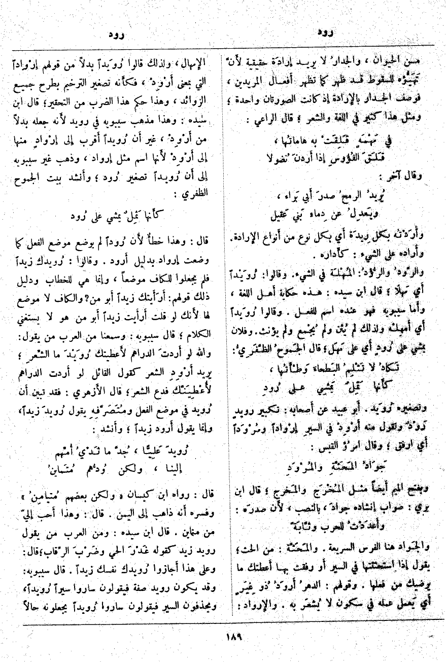 وَتَصْغِيرُهُ رُوَيد. أَبو عُبَيْدٍ عَنْ أَصحابه: تَكْبِيرُ رويدٍ رَوْدٌ وَتَقُولُ مِنْهُ أَرْوِدْ فِي السيرِ إِرْواداً ومُرْوَداً أَي ارْفُقْ؛ وَقَالَ إمرُؤ القيس:
