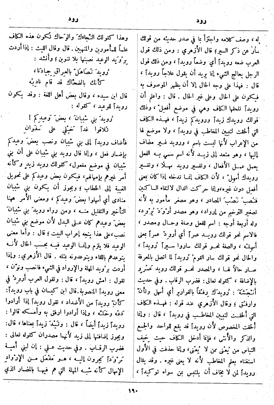 فأَضاف رُوَيْدًا إِلى بَنِي شَيْبَانَ وَنَصَبَ بعضَ وَعِيدِكُمْ بإِضمار فِعْلٍ، وإِنما قَالَ رُوَيْدَ بَنِي شَيْبَانَ عَلَى أَن بَنِي شَيْبَانَ فِي مَوْضِعِ مَفْعُولٍ، كَقَوْلِكَ رُوَيْدَ زيدٍ وكأَنه أَمر غَيْرَهُمْ بإِمهالهم، فَيَكُونُ بَعْضَ وَعِيدِكُمْ عَلَى تَحْوِيلِ الْغَيْبَةِ إِلى الْخِطَابِ؛ وَيَجُوزُ أَن يَكُونَ بَنِي شَيْبَانَ مُنَادَى أَي أَمهلوا بعضَ وَعِيدِكُمْ، وَمَعْنَى الأَمر هاهنا التأْهير وَالتَّقْلِيلُ مِنْهُ، وَمَنْ رَوَاهُ رويدَ بني شيبانَ بعضَ وَعِيدِهِمْ كَانَ عَلَى الْبَدَلِ لأَن مَوْضِعَ بَنِي شَيْبَانَ نُصِبَ، عَلَى هَذَا يَتَّجِهُ إِعراب الْبَيْتِ؛ قَالَ: وأَما مَعْنَى الْوَعِيدِ فَلَا يَلْزَمُ وإِنما الْوَعِيدُ فِيهِ بِحَسَبِ الْحَالِ لأَنه يَتَوَعَّدُهُمْ بِاللِّقَاءِ وَيَتَوَعَّدُونَهُ بِمِثْلِهِ. قَالَ الأَزهري: وإِذا أَردت برُويد الْمُهْلَةَ والإِرواد فِي الشَّيْءِ فَانْصُبْ وَنَوِّنْ، تَقُولُ: امْشِ رُوَيْدًا، قَالَ: وَتَقُولُ الْعَرَبُ أَروِدْ فِي مَعْنَى رُوَيْدًا الْمَنْصُوبَةِ. قَالَ ابْنُ كَيْسَانَ فِي بَابِ رُوَيْدًا: كأَنّ رُوَيْدًا مِنَ الأَضداد، تَقُولُ رُوَيْدًا إِذا أَرادوا دَعْه وخَلِّه، وإِذا أَرادوا ارْفُقْ بِهِ وأَمسكه قَالُوا: رُوَيْدًا زَيْدًا أَيضاً، قَالَ: وتَيْدَ زَيْدًا بِمَعْنَاهَا، قَالَ: وَيَجُوزُ إِضافتها إِلى زَيْدٍ لأَنهما مَصْدَرَانِ كَقَوْلِهِ تَعَالَى: فَضَرْبَ الرِّقابِ. وَفِي حَدِيثِ