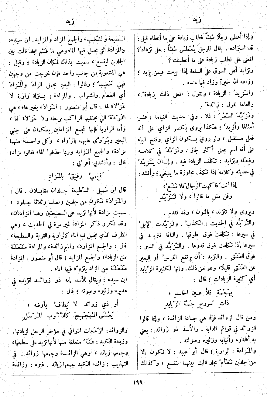 وإِذا أَعطى رَجُلًا شَيْئًا فَطَلَبَ زِيَادَةً عَلَى مَا أَعطاه قِيلَ: قَدِ اسْتَزَادَهُ. يُقَالُ لِلرَّجُلِ يُعْطَى شَيْئًا: هَلْ تزدادُ؟ الْمَعْنَى هَلْ تَطْلُبُ زِيَادَةً عَلَى مَا أَعطيتك؟ وَتَزَايَدَ أَهل السُّوقِ عَلَى السِّلْعَةِ إِذا بِيعَتْ فِيمَنْ يَزِيدُ، وَزَادَهُ اللَّه خيراً وزاد فِيمَا عِنْدَهُ. والْمَزِيدُ: الزِّيَادَةُ، وَتَقُولُ: افْعَلْ ذَلِكَ زِيادةً، وَالْعَامَّةُ تَقُولُ: زَائِدَةٌ. وتَزَيَّدَ السِّعْرُ: غَلَا. وَفِي حَدِيثِ الْقِيَامَةِ: