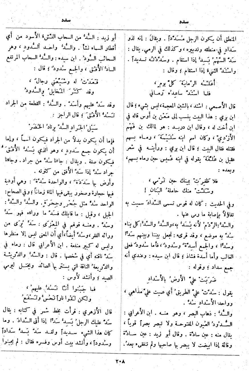 وسُدّاً، وَالْجَمْعُ أَسِدَّةٌ وسُدودٌ، فأَما سُدودٌ فَعَلَى الْغَالِبِ وأَما أَسدة فَشَاذٌّ؛ قَالَ ابْنُ سِيدَهْ: وَعِنْدِي أَنه جَمْعُ سِدَادٍ؛ وَقَوْلُهُ: