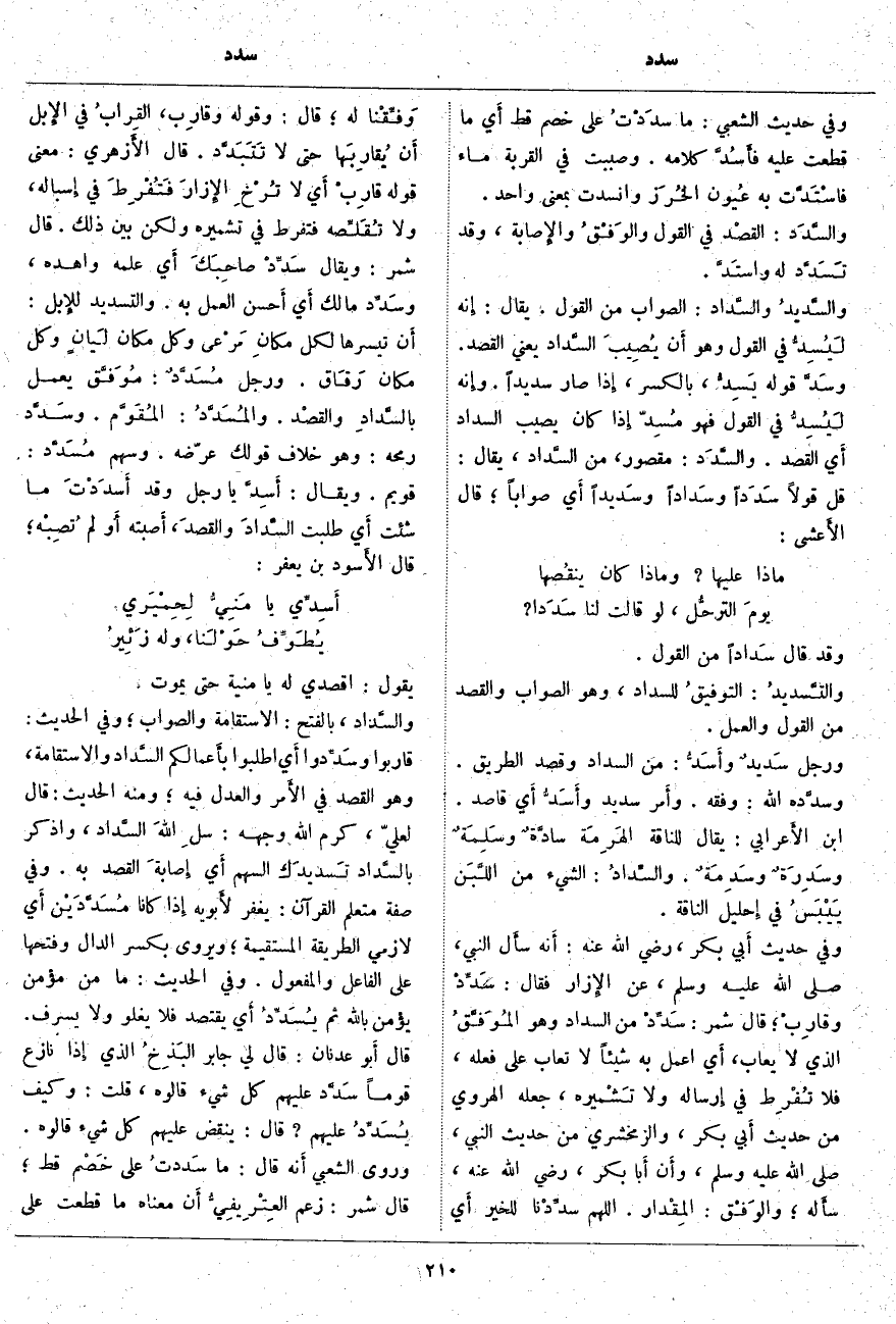 ؛ قَالَ شِمْرٌ: سَدِّدْ مِنَ السَّدَادِ وَهُوَ المُوَفَّقُ الَّذِي لَا يُعَابُ، أَي اعْمَلْ بِهِ شَيْئًا لَا تُعَابُ عَلَى فِعْلِهِ، فَلَا تُفْرِط فِي إِرساله وَلَا تَشْميره، جَعَلَهُ الْهَرَوِيُّ مِنْ حَدِيثِ أَبي بكر، والزمخشري مِنْ حَدِيثِ النَّبِيِّ، صَلَّى اللَّهُ عَلَيْهِ وَسَلَّمَ، وأَن أَبا بَكْرٍ، رَضِيَ اللَّهُ عَنْهُ، سأَله؛ والوَفْق: المِقْدار. اللَّهُمَّ سدِّدْنا لِلْخَيْرِ أَي وَفِّقْنا لَهُ؛ قَالَ: وَقَوْلُهُ وقارِب، القِرابُ فِي الإِبل أَن يُقارِبَها حَتَّى لَا تَتَبَدَّد. قَالَ الأَزهري: مَعْنَى قَوْلِهِ قارِبْ أَي لَا تُرْخِ الإِزارَ فَتُفْرِطَ فِي إِسباله، وَلَا تُقَلِّصه فَتُفَرِّطَ فِي تَشْمِيرِهِ وَلَكِنْ بَيْنَ ذَلِكَ. قَالَ شِمْرٌ: وَيُقَالُ سَدِّدْ صاحِبَكَ أَي عَلِّمْهُ واهده، وسَدِّد مَالَكَ أَي أَحسن الْعَمَلَ بِهِ. وَالتَّسْدِيدُ للإِبل: أَن تُيَسِّرَهَا لِكُلِّ مكانِ مَرْعى وَكُلِّ مَكَانٍ لَيانٍ وَكُلِّ مَكَانٍ رَقَاق. وَرَجُلٌ مُسَدَّدٌ: مُوَفَّق يَعْمَلُ بالسَّدادِ والقصْد. والمُسَدَّدُ: المُقوَّم. وسَدَّد رُمْحَهُ: وَهُوَ خِلَافُ قَوْلِكَ عَرَّضَهُ. وَسَهْمٌ مُسَدَّد: قَوِيمٌ. وَيُقَالُ: أَسِدَّ يَا رَجُلُ وَقَدْ أَسدَدْتَ مَا شِئْتَ أَي طَلَبْتَ السَّدادَ والقصدَ، أَصبته أَو لَمْ تُصِبْه؛ قَالَ الأَسود بْنُ يَعْفُرَ: