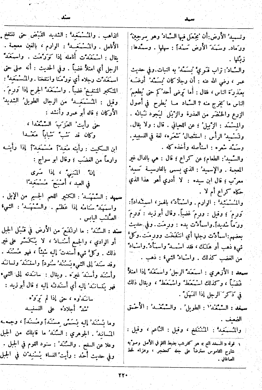 سند: السَّنَدُ: مَا ارتَفَعَ مِنَ الأَرض فِي قُبُل الْجَبَلِ أَو الْوَادِي، وَالْجَمْعُ أَسْنادٌ، لَا يُكَسَّر عَلَى غَيْرِ ذَلِكَ. وكلُّ شيءٍ أَسندتَ إِليه شَيْئًا، فَهُوَ مُسْنَد. وَقَدْ سنَدَ إِلى الشيءِ يَسْنُدُ سُنوداً واستَنَدَ وتسانَد وأَسْنَد وأَسنَدَ غيرَه. وَيُقَالُ: سانَدته إِلى الشَّيْءِ فَهُوَ يتَسانَدُ إِليه أَي أَسنَدتُه إِليه؛ قَالَ أَبو زَيْدٍ: