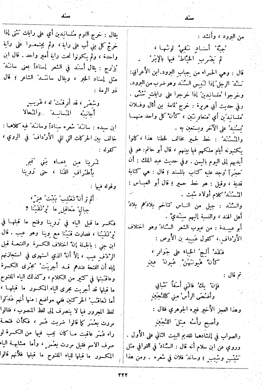 ؛ قَالَ: هِيَ كِتَابَةٌ قَدِيمَةٌ، وَقِيلَ: هُوَ خَطُّ حِمْيَرَ؛ قَالَ أَبو الْعَبَّاسِ: المُسْنَدُ كَلَامُ أَولاد شِيثٍ. والسِّنْد: جِيلٌ مِنَ النَّاسِ تُتاخم بلادُهم بلادَ أَهل الْهِنْدِ، وَالنِّسْبَةُ إِليهم سِنْديّ. أَبو عُبَيْدَةَ: مِنْ عُيُوبِ الشِّعْرِ السِّنادُ وهو اختلاف الأَرْدادِ، كَقَوْلِ عَبِيد بْنِ الأَبرص: