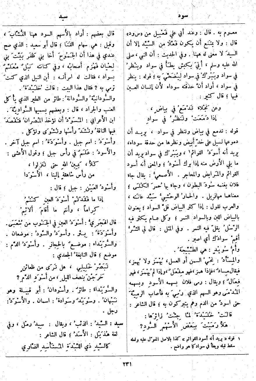 قَوْلُهُ: تَدْمَعُ فِي بَيَاضٍ وَتَنْظُرُ فِي سَوَادٍ، يُرِيدُ أَن دُمُوعَهَا تَسِيلُ عَلَى خدٍّ أَبيض وَنَظَرَهَا مِنْ حَدَقَةٍ سَوْدَاءَ، يُرِيدُ أَنه أَسوَدُ الْقَوَائِمِ «1»، ويَبْرُك فِي سَوَادٍ يُرِيدُ أَن مَا يَلِي الأَرض مِنْهُ إِذا بَرَكَ أَسْودُ؛ وَالْمَعْنَى أَنه أَسود الْقَوَائِمِ والمَرابض وَالْمَحَاجِرِ. الأَصمعيُّ: يُقَالُ جاءَ فُلَانٌ بِغَنَمَهِ سُودَ الْبُطُونِ، وجاءَ بِهَا حُمرَ الكُلَى؛ مَعْنَاهُمَا مهازِيل. والحمارُ الوحْشِيُّ سَيِّد عانَته، وَالْعَرَبُ تَقُولُ: إِذا كَثُرَ الْبَيَاضُ قلَّ السَّوَادُ؛ يَعْنُونَ بِالْبَيَاضِ اللَّبَنَ وَبِالسَّوَادِ التَّمْرَ؛ وَكُلُّ عَامٍ يَكْثُرُ فِيهِ الرِّسْلُ يَقِلُّ فِيهِ التَّمْرُ. وَفِي الْمَثَلِ: قَالَ لِي الشَّرُّ أَقِمْ سوادَك أَي اصْبِرْ. وأُمُّ سُويْدٍ: هِيَ الطِّبِّيجَةُ. والمِسْأَدُ: نِحْيُ السَّمْنِ أَو الْعَسَلِ، يُهْمَز وَلَا يُهمز، فَيُقَالُ مِسادٌ، فإِذا هُمِزَ، فَهُوَ مِفْعَلٌ، وإِذا لم يُهْمَز، فهو فِعَالٌ؛ وَيُقَالُ: رَمَى فُلَانٌ بِسَهْمِهِ الأَسودِ وَبِسَهْمِهِ المُدْمَى وَهُوَ السَّهْمُ الَّذِي رُمِيَ بِهِ فأَصاب الرمِيَّةَ حَتَّى اسْوَدَّ مِنَ الدَّمِ وَهُمْ يَتَبَرَّكُونَ بِهِ؛ قَالَ الشَّاعِرَ: