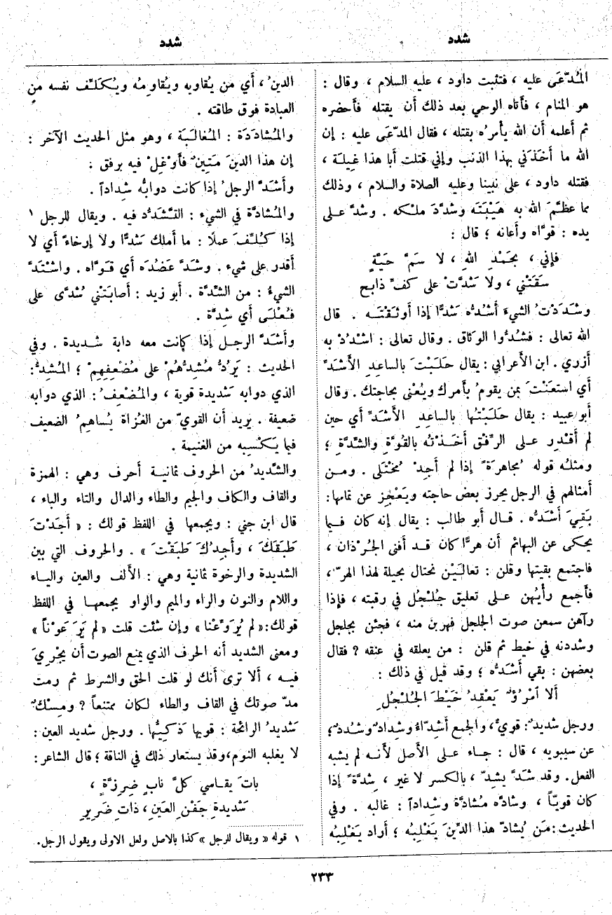 ؛ المُشِدُّ: الَّذِي دَوَابُّهُ شَديدة قَوِيَّةٌ، والمُضْعِفُ: الَّذِي دَوَابُّهُ ضَعِيفَةٌ. يُرِيدُ أَن الْقَوِيَّ مِنَ الغُزاة يُساهِمُ الضَّعِيفَ فِيمَا يَكْسِبه مِنَ الْغَنِيمَةِ. والشَّديدُ مِنَ الْحُرُوفِ ثَمَانِيَةُ أَحرف وَهِيَ: الْهَمْزَةُ وَالْقَافُ وَالْكَافُ وَالْجِيمُ وَالطَّاءُ وَالدَّالُ وَالتَّاءُ وَالْبَاءُ، قَالَ ابْنُ جِنِّي: وَيَجْمَعُهَا في اللفظ قولك: [أَجَدْتَ طَبَقَكَ، وأَجِدُكَ طَبَقْتَ]. وَالْحُرُوفُ الَّتِي بَيْنَ الشَّدِيدَةِ وَالرَّخْوَةِ ثَمَانِيَةٌ وَهِيَ: الأَلف وَالْعَيْنُ وَالْيَاءُ وَاللَّامُ وَالنُّونُ وَالرَّاءُ وَالْمِيمُ وَالْوَاوُ يَجْمَعُهَا فِي اللَّفْظِ قَوْلُكَ: [لَمْ يُرَوِّعْنا] وإِن شِئْتَ قُلْتَ [لَمْ يَرَ عَوْناً] وَمَعْنَى الشَّدِيدِ أَنه الْحَرْفُ الَّذِي يَمْنَعُ الصَّوْتَ أَن يجْرِيَ فِيهِ، أَلا تَرَى أَنك لَوْ قُلْتَ الْحَقَّ وَالشَّرْطَ ثُمَّ رُمْتَ مَدَّ صَوْتِكَ فِي الْقَافِ وَالطَّاءِ لَكَانَ مُمْتَنِعًا؟ ومِسْكٌ شَديدُ الرَّائِحَةِ: قَوِيُّهَا ذَكِيُّها. وَرَجُلٌ شَدِيدُ الْعَيْنِ: لَا يَغْلِبُهُ النَّوْمُ، وَقَدْ يُسْتَعَارُ ذَلِكَ فِي النَّاقَةِ؛ قَالَ الشَّاعِرُ: