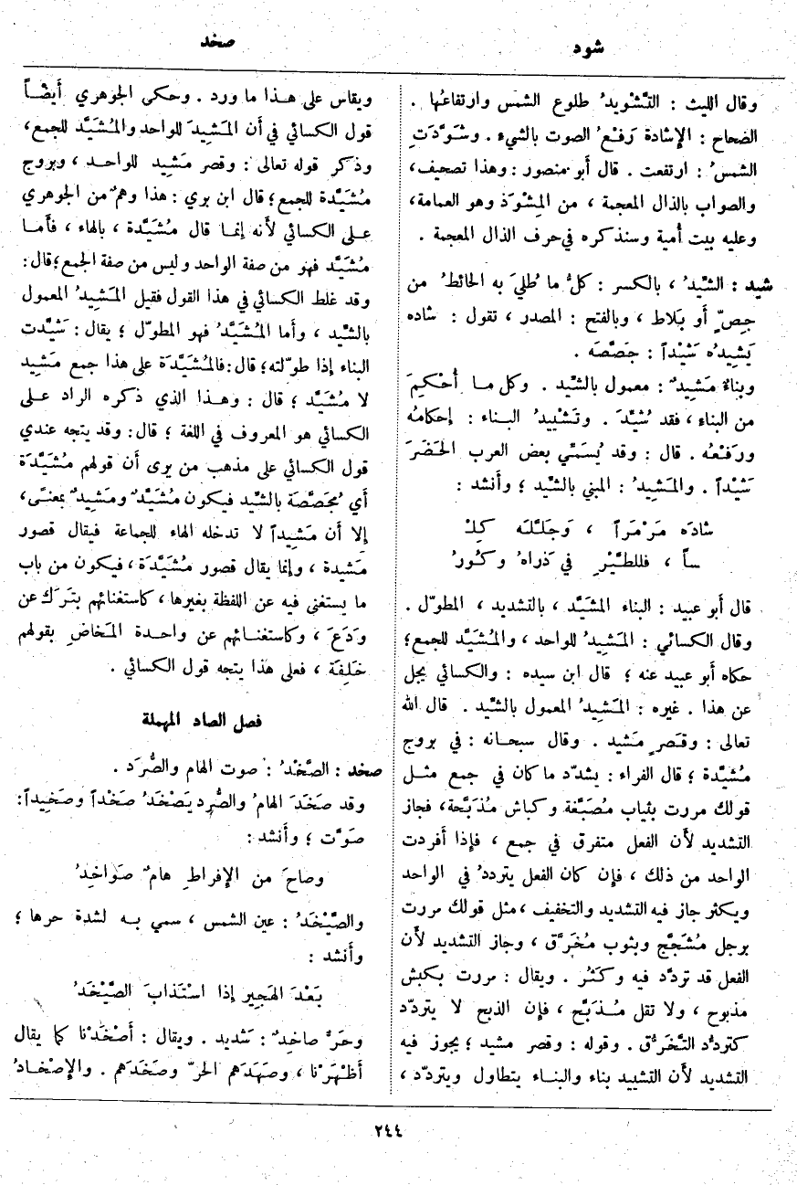 شيد: الشِّيدُ، بِالْكَسْرِ: كلُّ مَا طُليَ بِهِ الحائطُ من جِصٍّ أَو بَلاط، وَبِالْفَتْحِ: الْمَصْدَرُ، تَقُولُ: شَادَّهُ يَشِيدُه شَيْداً: جَصَّصَه. وبناءٌ مَشِيدٌ: مَعْمُولٌ بالشِّيد. وَكُلُّ مَا أُحْكِمَ مِنَ البناءِ، فَقَدْ شُيِّدَ. وتَشْييدُ الْبِنَاءِ: إِحكامُه ورَفْعُه. قَالَ: وَقَدْ يُسَمِّي بَعْضُ الْعَرَبِ الحَضَرَ شَيْداً. والمَشِيدُ: الْمَبْنِيُّ بالشِّيد؛ وأَنشد: