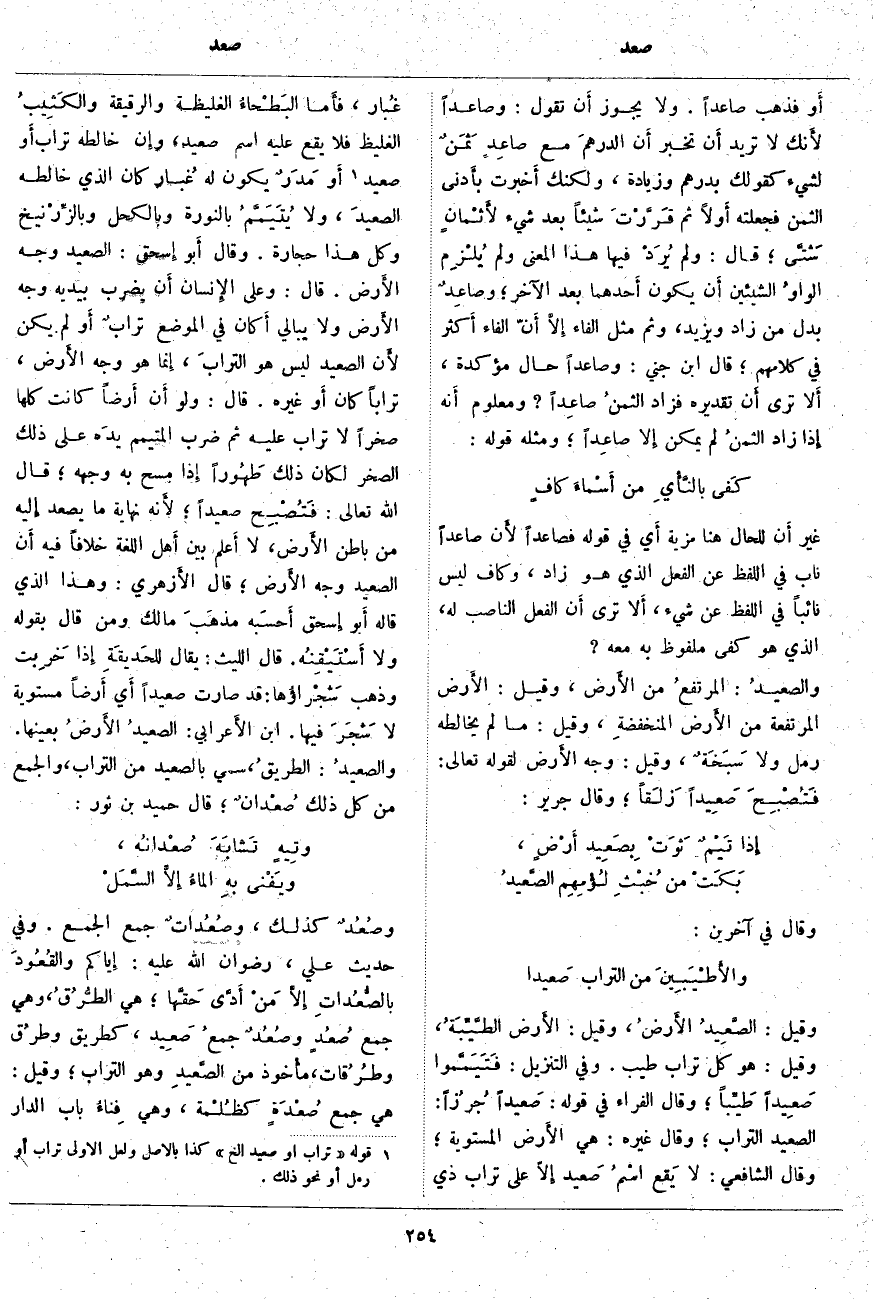 غَيْرَ أَن لِلْحَالِ هُنَا مَزِيَّةً أَي فِي قَوْلِهِ فَصَاعِدًا لأَن صَاعِدًا نَابَ فِي اللَّفْظِ عَنِ الْفِعْلِ الَّذِي هُوَ زَادَ، وَكَافٍ لَيْسَ نَائِبًا فِي اللَّفْظِ عَنْ شَيْءٍ، أَلا تَرَى أَن الْفِعْلَ النَّاصِبَ لَهُ، الَّذِي هُوَ كَفَى مَلْفُوظٌ بِهِ مَعَهُ؟ والصعيدُ: المرتفعُ مِنَ الأَرض، وَقِيلَ: الأَرض الْمُرْتَفِعَةُ مِنَ الأَرض المنخفضةِ، وَقِيلَ: مَا لَمْ يُخَالِطْهُ رَمْلٌ وَلَا سَبَخَةٌ، وَقِيلَ: وَجْهُ الأَرض لِقَوْلِهِ تَعَالَى: فَتُصْبِحَ صَعِيداً زَلَقاً