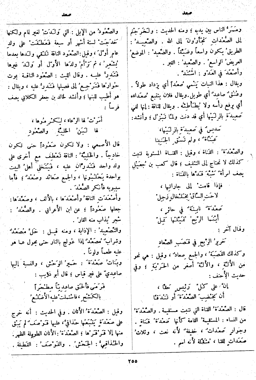 قَالَ الأَصمعي: وَلَا تَكُونُ صَعُوداً حَتَّى تَكُونَ خادِجاً. والخَلِيَّةُ: النَّاقَةُ تَعْطِف مَعَ أُخرى عَلَى وَلَدٍ وَاحِدٍ فَتَدِرَّانِ عَلَيْهِ، فَيَتَخلى أَهلُ الْبَيْتِ بِوَاحِدَةٍ يَحْلُبُونها، وَالْجَمْعُ صَعائد وصُعُدٌ؛ فأَما سِيبَوَيْهِ فأَنكر الصُّعُدَ. وأَصْعَدَتِ الناقةُ وأَصْعَدَها، بالأَلف، وصَعَّدَها: جَعَلَهَا صَعُوداً؛ عَنِ ابْنِ الأَعرابي. والصُّعُد: شَجَرٌ يُذاب مِنْهُ القارُ. والتَّصْعِيدُ: الإِذابة، وَمِنْهُ قِيلَ: خلٌّ مُصَعَّدٌ وشرابٌ مُصَعَّدٌ إِذا عُولج بِالنَّارِ حَتَّى يُحَوَّلَ عَمَّا هُوَ عَلَيْهِ طَعْمًا وَلَوْنًا. وبَناتُ صَعْدَةَ: حَميرُ الوَحْش، وَالنِّسْبَةُ إِليها صاعِديّ عَلَى غَيْرِ قِيَاسٍ؛ قَالَ أَبو ذؤَيب: