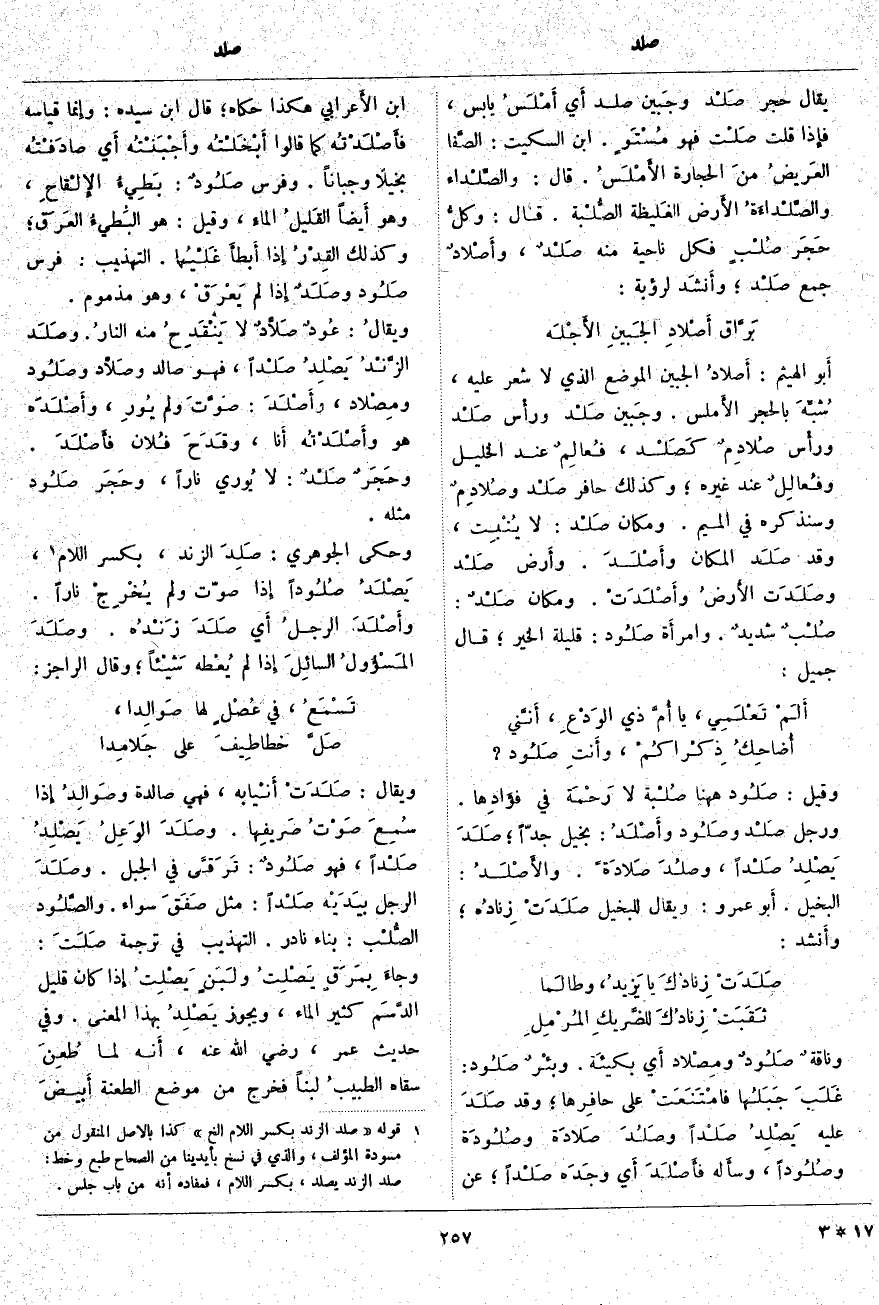 (2). قوله [صَلِدَ الزَّنْدُ بِكَسْرِ اللَّامِ إلخ] كذا بالأَصل المنقول من مسودة المؤلف، والذي في نسخ بأيدينا من الصحاح طبع وخط: صلد الزند يصلد، بكسر اللام، فمفاده أنه من باب جلس.