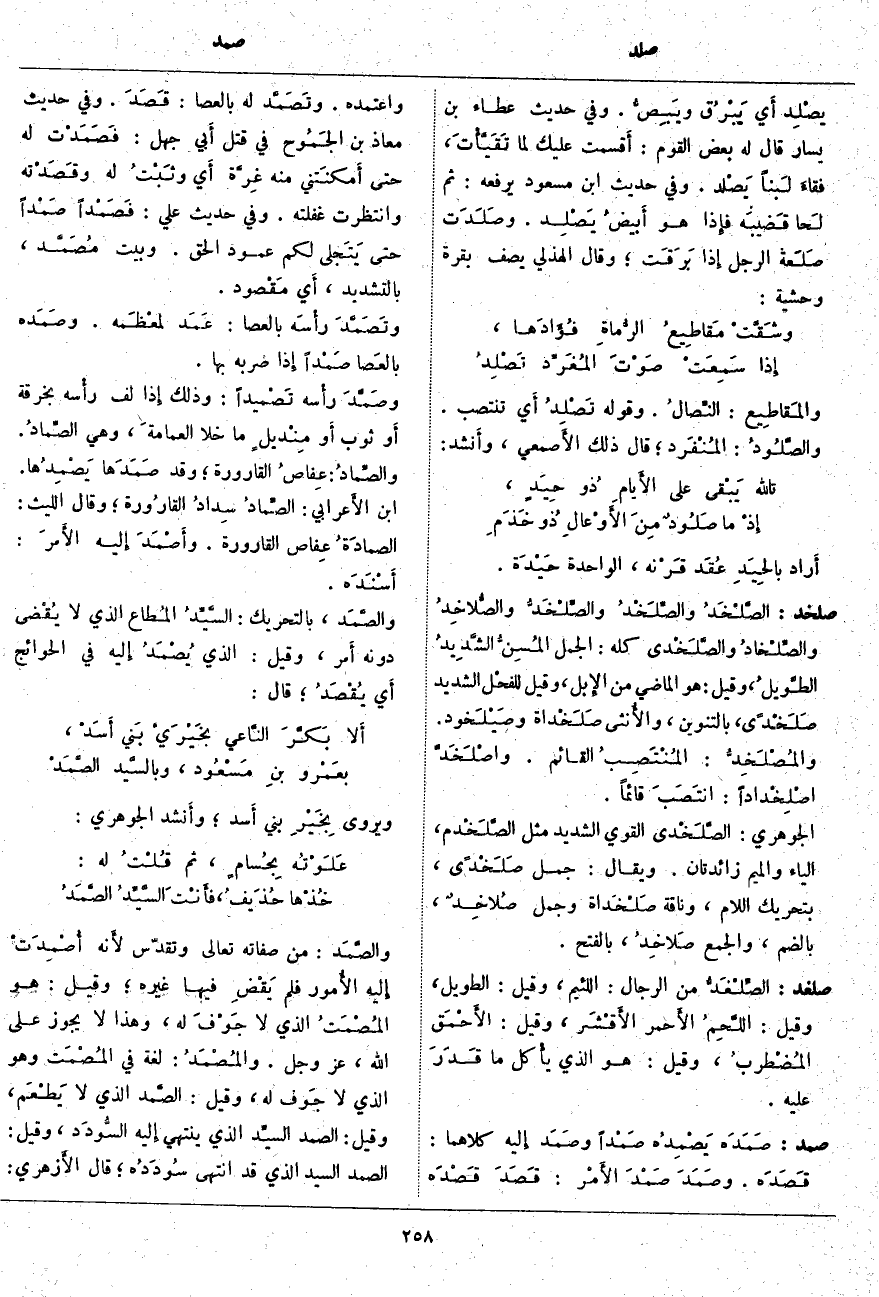 صلخد: الصَّلْخَدُ والصِّلَخْدُ والصِّلْخَدُّ والصُّلاخِدُ والصِّلْخادُ والصَّلَخْدى كُلُّهُ: الْجَمَلُ المُسِنُّ الشَّديدُ الطَّويلُ، وَقِيلَ: هُوَ الْمَاضِي مِنَ الإِبل، وَقِيلَ للفحْل الشَّدِيدِ صَلَخْدًى، بِالتَّنْوِينِ، والأُنثى صَلَخْداة وصَيْلَخود. والمُصْلَخِدُّ: المُنْتَصِبُ الْقَائِمُ. واصْلَخَدَّ اصْلِخْداداً: انتَصَبَ قَائِمًا. الْجَوْهَرِيُّ: الصَّلَخْدى الْقَوِيُّ الشَّدِيدُ مِثْلُ الصَّلَخْدم، الْيَاءُ وَالْمِيمُ زَائِدَتَانِ. وَيُقَالُ: جَمَلٌ صَلَخْدًى، بِتَحْرِيكِ اللَّامِ، وَنَاقَةٌ صَلْخَداة وَجَمَلٌ صُلاخِدٌ، بِالضَّمِّ، وَالْجَمْعُ صَلاخِدُ، بالفتح.