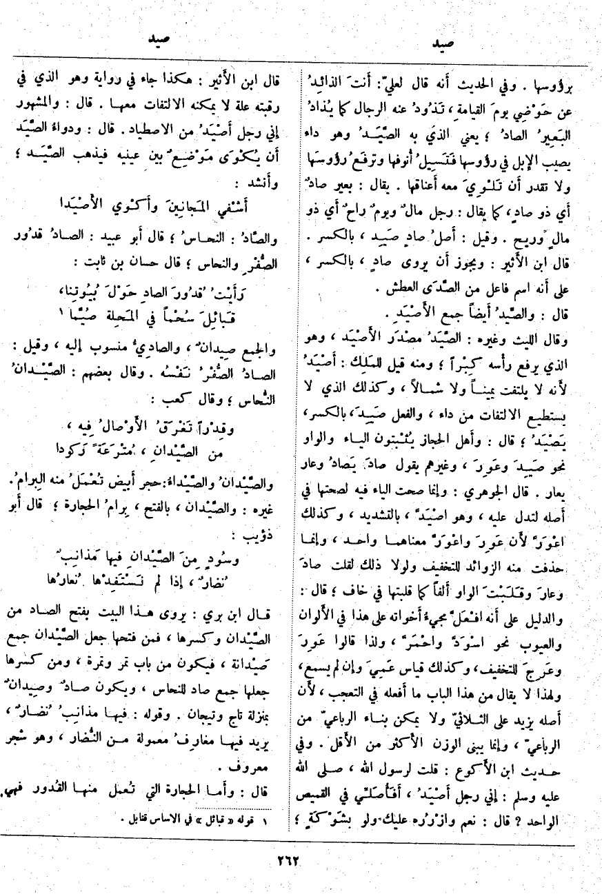 ؛ يَعْنِي الَّذِي بِهِ الصَّيَدُ وَهُوَ دَاءٌ يُصِيبُ الإِبل فِي رؤُوسها فَتَسِيلُ أُنوفها وترفَعُ رؤُوسَهَا وَلَا تَقْدِرُ أَن تَلْوِيَ مَعَهُ أَعناقها. يُقَالُ: بَعِيرٌ صادٌ أَي ذُو صادٍ، كَمَا يُقَالُ: رَجُلٌ مالٌ ويومٌ راحٌ أَي ذُو مالٍ وَرِيحٍ. وَقِيلَ: أَصلُ صادٍ صَيِد، بِالْكَسْرِ. قَالَ ابْنُ الأَثير: وَيَجُوزُ أَن يُرْوَى صادٍ، بِالْكَسْرِ، عَلَى أَنه اسْمُ فَاعِلٍ مِنَ الصَّدَى الْعَطَشُ. قَالَ: والصِّيدُ أَيضاً جَمْعُ الأَصْيَدِ. وَقَالَ اللَّيْثُ وَغَيْرُهُ: الصَّيَدُ مصْدَر الأَصْيَد، وَهُوَ الَّذِي يَرْفَعُ رأْسه كِبْراً؛ وَمِنْهُ قِيلَ للمَلِك: أَصْيَدُ لأَنه لَا يَلْتَفِتُ يَمِينًا وَلَا شِمَالًا، وَكَذَلِكَ الَّذِي لَا يَسْتَطِيعُ الِالْتِفَاتَ مِنْ دَاءٍ، وَالْفِعْلُ صَيِدَ، بِالْكَسْرِ، يَصْيدُ؛ قَالَ: وأَهل الْحِجَازِ يُثْبتون الْيَاءَ وَالْوَاوَ نَحْوَ صَيِدَ وعَوِرَ، وَغَيْرُهُمْ يَقُولُ صادَ يَصادُ وَعَارَ يَعَارُ. قَالَ الْجَوْهَرِيُّ: وإِنما صَحَّتِ الْيَاءُ فِيهِ لِصِحَّتِهَا فِي أَصله لِتَدُلَّ عَلَيْهِ، وَهُوَ اصْيَدَّ، بِالتَّشْدِيدِ، وَكَذَلِكَ اعْوَرَّ لأَن عَوِرَ واعْوَرَّ مَعْنَاهُمَا وَاحِدٌ، وإِنما حُذِفَتْ مِنْهُ الزَّوَائِدُ لِلتَّخْفِيفِ وَلَوْلَا ذَلِكَ لَقُلْتَ صادَ وعارَ وقَلَبْتَ الْوَاوَ أَلفاً كَمَا قَلَبْتَهَا فِي خَافَ؛ قَالَ: وَالدَّلِيلُ عَلَى أَنه افْعَلَّ مجيءُ أَخواته عَلَى هَذَا فِي الأَلوان وَالْعُيُوبِ نَحْوَ اسْوَدَّ واحْمَرَّ، وَلِذَا قَالُوا عَوِرَ وعَرِجَ لِلتَّخْفِيفِ، وَكَذَلِكَ قِيَاسُ عَمِيَ وإِن لَمْ يَسْمَعْ، وَلِهَذَا لَا يُقَالُ مِنْ هَذَا الْبَابِ مَا أَفعله فِي التَّعَجُّبِ، لأَن أَصله يَزِيدُ عَلَى الثُّلَاثِيِّ وَلَا يُمْكِنُ بِنَاءُ الرُّبَاعِيِّ مِنَ الرُّبَاعِيِّ، وإِنما يُبْنَى الْوَزْنُ الأَكثر مِنَ الأَقل. وَفِي حَدِيثِ