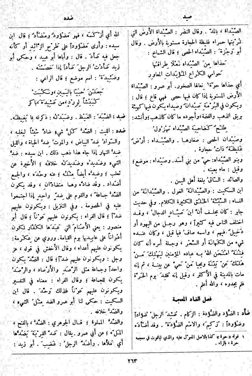 ؛ قَالَ: الضِّدّ يَكُونُ وَاحِدًا وَجَمَاعَةً مِثْلُ الرَّصَدِ والأَرْصاد، والرَّصَدُ يَكُونُ لِلْجَمَاعَةِ؛ وَقَالَ الْفَرَّاءُ: مَعْنَاهُ فِي التَّفْسِيرِ وَيَكُونُونَ عَلَيْهِمْ عَوْناً فَلِذَلِكَ وَحَّدَ. قَالَ ابْنُ السِّكِّيتِ: حَكَى لَنَا أَبو عَمْرٍو الضِّدُّ مِثْلُ الشيءِ، والضّدُّ خِلَافُهُ. والضَّدُّ المملوءُ، قَالَ الْجَوْهَرِيُّ: الضَّدُّ، بِالْفَتْحِ، المَلْء؛ عَنْ أَبي عَمْرٍو. يُقَالُ: ضَدَّ القِرْبَةَ يَضُدُّها أَي مَلأَها. وأَضَدَّ الرجلُ: غَضِبَ. أَبو زيد: