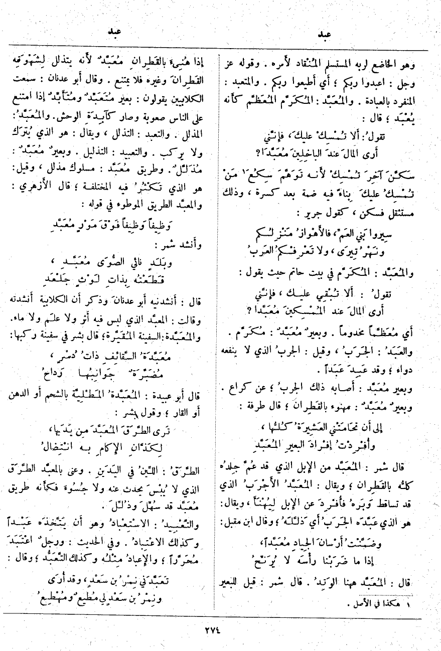 قَالَ: المُعَبَّد هَاهُنَا الوَتِدُ. قَالَ شَمِرٌ: قِيلَ لِلْبَعِيرِ إِذا هُنِئَ بالقَطِرانِ مُعَبَّدٌ لأَنه يَتَذَلَّلُ لِشَهْوَتِه القَطِرانَ وَغَيْرَهُ فَلَا يَمْتَنِعُ. وَقَالَ أَبو عَدْنَانَ: سَمِعْتُ الْكِلَابِيِّينَ يَقُولُونَ: بَعِيرٌ مُتَعَبِّدٌ ومُتَأَبِّدٌ إِذا امْتَنَعَ عَلَى النَّاسِ صُعُوبَةً وَصَارَ كآبِدَةِ الْوَحْشِ. والمُعَبَّدُ: الْمُذَلَّلُ. وَالتَّعَبُّدُ: التَّذَلُّلُ، وَيُقَالُ: هُوَ الَّذِي يُترَك وَلَا يُرْكَبُ. وَالْتَعْبِيدُ: التَّذْلِيلُ. وبعيرٌ مُعَبَّدٌ: مُذَلَّلٌ. وَطَرِيقٌ مُعَبَّد: مَسْلُوكٌ مُذَلَّلٌ، وَقِيلَ: هُوَ الَّذِي تَكْثُرُ فِيهِ الْمُخْتَلِفَةُ؛ قَالَ الأَزهري: والمعبَّد الطَّرِيقُ الْمَوْطُوءُ فِي قَوْلِهِ: