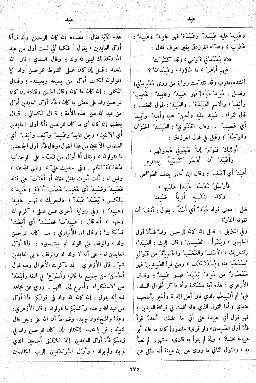 ؛ قَالَ اللَّيْثُ: العَبَدُ، بِالتَّحْرِيكِ، الأَنَفُ والغَضَبُ والحَمِيَّةُ مِنْ قَوْلٍ يُسْتَحْيا مِنْهُ ويُسْتَنْكَف، وَمَنْ قرأَ العَبِدِينَ فَهُوَ مَقْصُورٌ مِنْ عَبِدَ يَعْبَدُ فَهُوَ عَبِدٌ؛ وَقَالَ الأَزهري: هَذِهِ آيَةٌ مُشْكِلَةٌ وأَنا ذَاكِرُ أَقوال السَّلَفِ فِيهَا ثُمَّ أُتْبِعُها بِالَّذِي قَالَ أَهل اللُّغَةِ وأُخبر بأَصحها عَنْدِي؛ أَما الْقَوْلُ الَّذِي قَالَهُ اللَّيْثُ فِي قراءَة الْعَبِدِينَ، فَهُوَ قَوْلُ أَبي عُبَيْدَةَ عَلَى أَني مَا عَلِمْتُ أَحداً قرأَ فأَنا أَول العَبِدين، وَلَوْ قرئَ مَقْصُورًا كَانَ مَا قَالَهُ أَبو عُبَيْدَةَ مُحْتَمَلًا، وإِذ لَمْ يقرأْ بِهِ قَارِئٌ مَشْهُورٌ لَمْ نعبأْ بِهِ، وَالْقَوْلُ الثَّانِي مَا رُوِيَ عَنِ