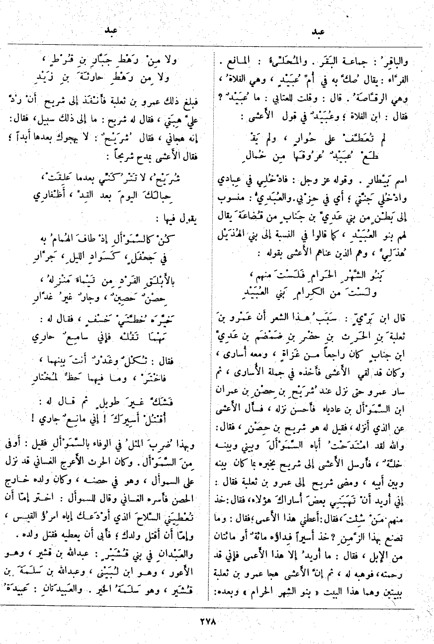 وَبِهَذَا ضُرِبَ المثلُ فِي الْوَفَاءِ بالسَّمَوْأَلِ فَقِيلَ: أَوفى مِنَ السَّمَوْأَل. وكان الحرث الأَعرج الْغَسَّانِيُّ قَدْ نَزَلَ عَلَى السموأَل، وَهُوَ فِي حِصْنِهِ، وَكَانَ وَلَدُهُ خَارِجَ الْحِصْنِ فأَسره الْغَسَّانِيُّ وَقَالَ للسموأَل: اخْتَرْ إِمّا أَن تُعْطِيَني السِّلاحَ الَّذِي أَوْدَعك إِياه إمرُؤُ الْقَيْسِ، وإِمّا أَن أَقتل وَلَدَكَ؛ فأَبى أَن يُعْطِيَهُ فَقَتَلَ وَلَدَهُ. والعَبْدانِ فِي بَنِي قُشَيْرٍ: عَبْدُ اللَّهِ بْنُ قُشَيْرٍ، وَهُوَ الأَعور، وَهُوَ ابْنُ لُبَيْنى، وَعَبْدُ اللَّهِ بْنُ سَلَمَةَ بْنُ قُشَير، وَهُوَ سَلَمَةُ الْخَيْرِ. والعَبيدَتانِ: عَبيدَةُ