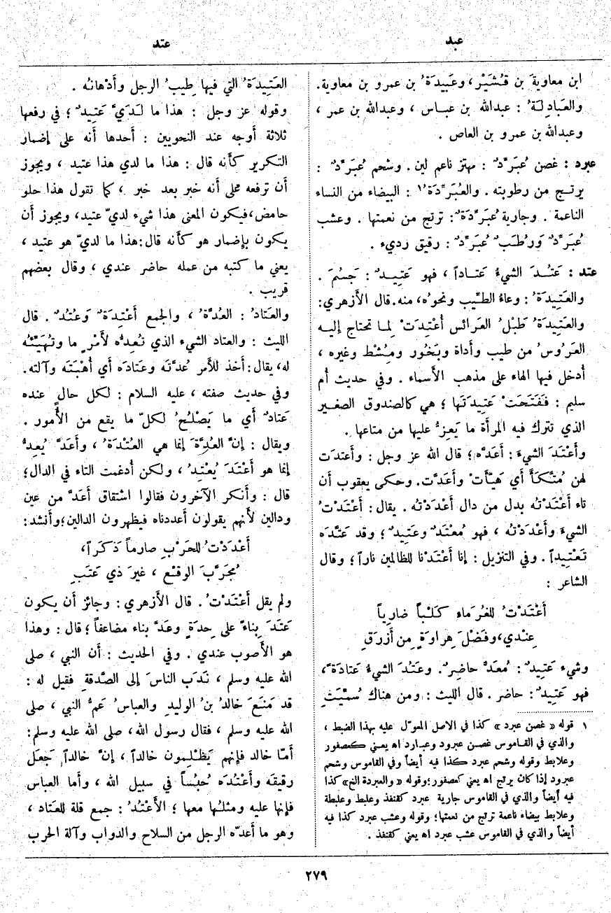 وَشَيْءٌ عَتِيدٌ: مُعَدٌّ حاضِرٌ. وعَتُدَ الشيءُ عَتادَةً، فَهُوَ عَتِيدٌ: حَاضِرٌ. قَالَ اللَّيْثُ: وَمِنْ هُنَاكَ سُمِّيَتِ العَتِيدَةُ الَّتِي فِيهَا طِيبُ الرَّجُلِ وأَدْهانُه. وَقَوْلُهُ عَزَّ وَجَلَّ: هَذَا مَا لَدَيَّ عَتِيدٌ
