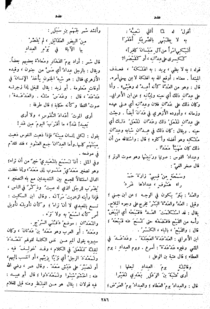 قَوْلُهُ: بِهِ لَا بِظَبْيٍ، يُرِيدُ: بِهِ الهَلَكَةُ، فَحَذَفَ المبتدأَ. مَعْنَاهُ: أَوقع اللَّهُ بِهِ الْهِلْكَةَ لَا بِمَنْ يُهِمُّنِي أَمره. قَالَ: وَهُوَ مِنَ العُدَّة كأَنه أُعِدَّ لَهُ وهُيِّئَ. وأَنا عَلَى عِدَّانِ ذَلِكَ أَي حِينِهِ وإِبَّانِه؛ عَنِ ابْنِ الأَعرابي. وَكَانَ ذَلِكَ عَلَى عَدَّانِ فُلَانٍ وعِدَّانِه أَي عَلَى عَهْدِهِ وَزَمَانِهِ، وأَورده الأَزهري فِي عَدَنَ أَيضاً. وَجِئْتُ عَلَى عِدَّانِ تَفْعَلُ ذَلِكَ وعَدَّان تَفْعَلُ ذَلِكَ أَي حِينِهِ. وَيُقَالُ: كَانَ ذَلِكَ فِي عِدَّانِ شَبَابِهِ وعِدَّانِ مُلْكِه وَهُوَ أَفضله وأَكثره؛ قَالَ: وَاشْتِقَاقُهُ مِنْ أَن ذَلِكَ كَانَ مُهَيَّأً مُعَدّاً. وعِدادُ الْقَوْسِ: صَوْتُهَا ورَنِينُها وَهُوَ صَوْتُ الْوَتَرِ؛ قَالَ صَخْرُ الْغَيِّ: