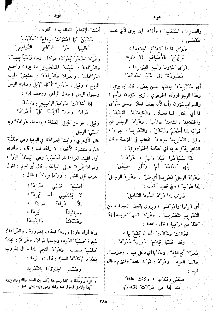 وإِنما أَراد عَارِدًا وَبَارِدًا فَحَذَفَ لِلضَّرُورَةِ. والعَرادةُ: شَجَرَةٌ صُلْبَةُ العُود، وَجَمْعُهَا عَرادٌ. وعَرادٌ: نبتٌ صُلْبٌ مُنْتَصِبٌ. وعَرَّدَ النجمُ إِذا مَالَ لِلْغُرُوبِ بَعْدَ ما يُكَبِّدُ السماءَ؛ قَالَ ذُو الرُّمَّةِ: