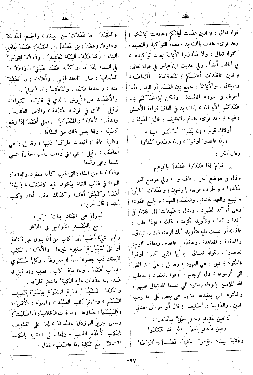وَقَالَ فِي مَوْضِعٍ آخَرَ: عَاقَدُوا، وَفِي مَوْضِعٍ آخَرَ: عَقَّدوا، وَالْحَرْفُ قُرِئَ بِالْوَجْهَيْنِ؛ وعَقَدْتُ الحبْلَ وَالْبَيْعَ وَالْعَهْدَ فَانْعَقَدَ. والعَقْد: الْعَهْدُ، وَالْجَمْعُ عُقود، وَهِيَ أَوكد العُهود. وَيُقَالُ: عَهِدْتُ إِلى فلانٍ فِي كَذَا وَكَذَا، وتأْويله أَلزمته ذَلِكَ، فإِذا قُلْتَ: عَاقَدْتُهُ أَو عَقَدْتُ عَلَيْهِ فتأْويله أَنك أَلزمته ذَلِكَ بِاسْتِيثَاقٍ. وَالْمُعَاقَدَةُ: الْمُعَاهَدَةُ. وَعَاقَدَهُ: عهده. وَتَعَاقَدَ الْقَوْمُ: تَعَاهَدُوا. وَقَوْلُهُ تَعَالَى: يَا أَيُّهَا الَّذِينَ آمَنُوا أَوْفُوا بِالْعُقُودِ