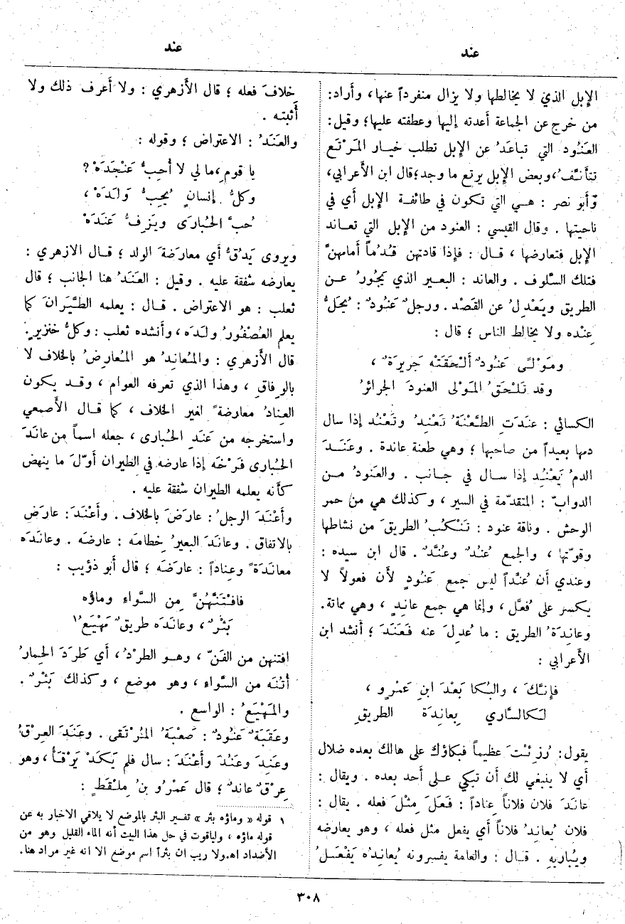 الإِبل الَّذِي لَا يُخَالِطُهَا وَلَا يَزَالُ مُنْفَرِدًا عَنْهَا، وأَراد: مَنْ خَرَجَ عَنِ الْجَمَاعَةِ أَعدته إِليها وَعَطَفْتُهُ عَلَيْهَا؛ وَقِيلَ: العَنُود الَّتِي تباعَدُ عَنِ الإِبل تَطْلُبُ خِيَارَ المَرْتَع تتأَنَّفُ، وَبَعْضُ الإِبل يَرْتَعُ مَا وَجَدَ؛ قَالَ ابْنُ الأَعرابي، وأَبو نَصْرٍ: هِيَ الَّتِي تَكُونُ فِي طَائِفَةِ الإِبل أَي فِي نَاحِيَتِهَا. وَقَالَ الْقَيْسِيُّ: الْعَنُودُ مِنَ الإِبل الَّتِي تُعَانِدُ الإِبل فَتُعَارِضُهَا، قَالَ: فإِذا قَادَتْهُنَّ قُدُماً أَمامهنَّ فَتِلْكَ السَّلوف. وَالْعَانِدُ: الْبَعِيرُ الذي يَجُورُ عَنِ الطَّرِيقِ ويَعْدِلُ عَنِ القَصْد. ورجلٌ عَنُودٌ: يُحَلُّ عِنْده وَلَا يُخَالِطُ النَّاسَ؛ قَالَ: