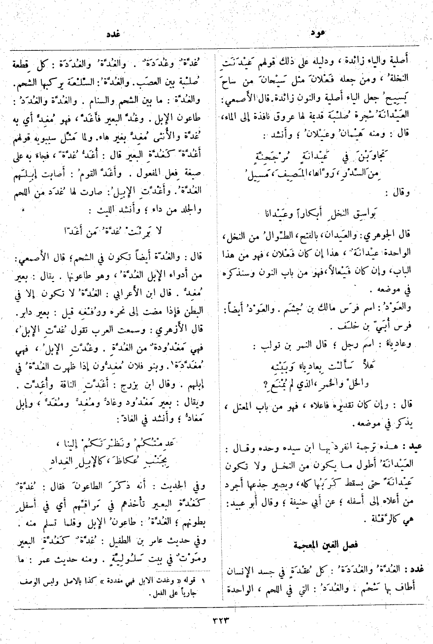 غدد: الغُدَّةُ والغُددَةُ: كُلُّ عُقْدَةٍ فِي جَسَدِ الإِنسان أَطاف بِهَا شَحْم. والغُدَدُ: الَّتِي فِي اللَّحْمِ، الْوَاحِدَةُ غُدَّةٌ وغُدَدَةٌ. والغُدٌةُ والغُدَدَة: كُلُّ قِطعة صُلْبة بَيْنَ العصَب. والغُدَّةُ: السِّلْعَة يَرْكَبُهَا الشَّحْمُ. والغُدَّة: مَا بَيْنَ الشَّحْمِ وَالسَّنَامِ. والغُدَّة والغُدَدُ: طَاعُونُ الإِبل. وغُدَّ الْبَعِيرُ فأَغَدَّ، فَهُوَ مُغِدٌّ أَي بِهِ غُدَّة والأُنثى مُغِدٌّ بِغَيْرِ هَاءٍ. وَلَمَّا مَثَّل سِيبَوَيْهِ قَوْلَهُمْ أَغُدَّةً كَغُدَّةِ الْبَعِيرِ قَالَ: أُغَدُّ غُدَّةً، فجاءَ بِهِ عَلَى صِيغَةِ فِعل الْمَفْعُولِ. وأَغَدَّ القومُ: أَصابت إِبِلَهم الغُدَّةُ. وأَغَدَّتِ الإِبِلُ: صَارَتْ لَهَا غُدَد مِنَ اللَّحْمِ وَالْجِلْدِ مِنْ دَاءٍ؛ وأَنشد اللَّيْثُ: