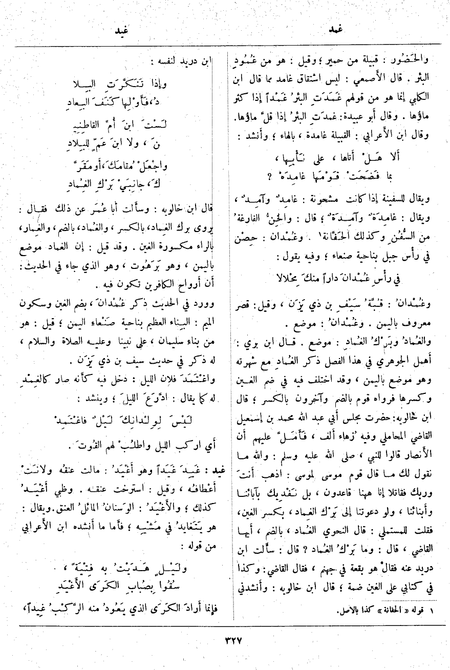 وَيُقَالُ لِلسَّفِينَةِ إِذا كَانَتْ مَشْحُونَةً: غامِدٌ وآمِدٌ، وَيُقَالُ: غامِدَةٌ وآمِدَةٌ؛ قَالَ: والخِنُّ الفارغةُ مِنَ السُّفُنِ وَكَذَلِكَ الحَفَّانَة «1». وغُمْدان: حِصْن فِي رأْس جَبَلٍ بِنَاحِيَةِ صَنْعَاءَ؛ وَفِيهِ يَقُولُ: