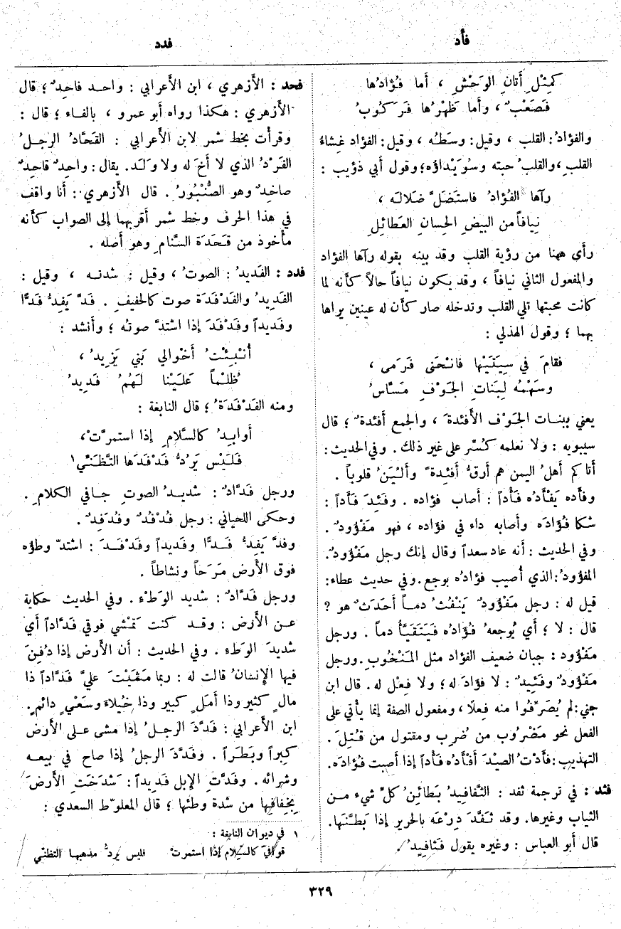 والفؤادُ: الْقَلْبُ، وَقِيلَ: وسَطُه، وَقِيلَ: الْفُؤَادُ غِشاءُ القلبِ، والقلبُ حَبَّتُهُ وسُوَيْداؤُه؛ وَقَوْلُ أَبي ذُؤَيْبٍ: