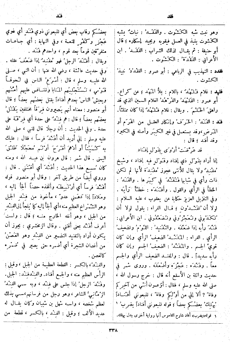 فند: الفَنَدُ: الخَرَفُ وإِنكار الْعَقْلِ مِنَ الهَرَم أَو المَرضِ، وَقَدْ يُسْتَعْمَلُ فِي غَيْرِ الكِبَر وأَصله فِي الْكِبَرِ، وَقَدْ أَفند؛ قَالَ:
