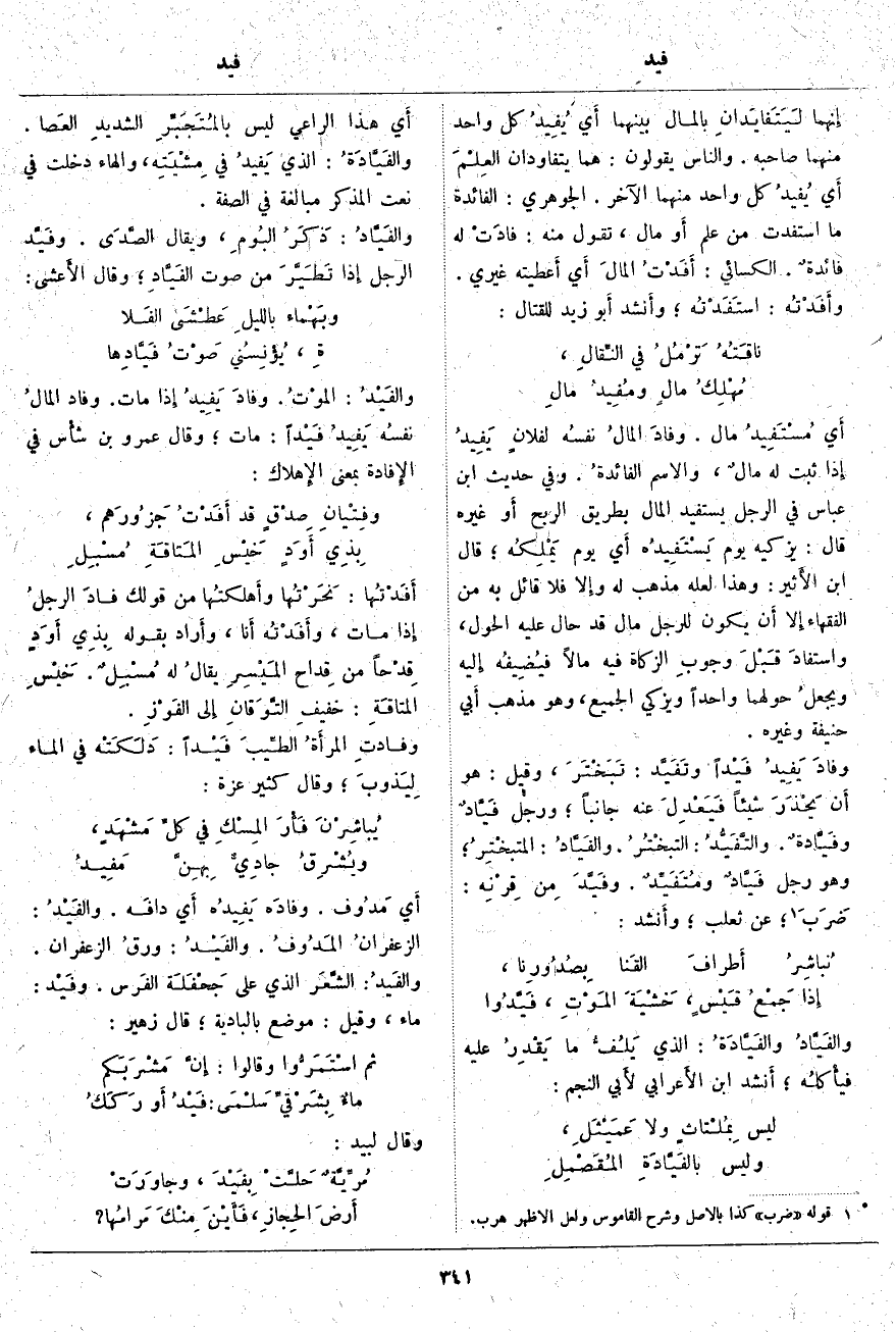 أَي يَوْمَ يَمْلِكُه؛ قَالَ ابْنُ الأَثير: وَهَذَا لَعَلَّهُ مَذْهَبٌ لَهُ وإِلا فَلَا قَائِلَ بِهِ مِنَ الْفُقَهَاءِ إِلا أَن يَكُونَ لِلرَّجُلِ مَالٌ قَدْ حَالَ عَلَيْهِ الْحَوْلُ، واستفادَ قَبْلَ وجوبِ الزَّكَاةِ فِيهِ مَالًا فيُضِيفُه إِليه ويجعلُ حَوْلَهُمَا وَاحِدًا وَيُزَكِّي الْجَمِيعُ، وَهُوَ مَذْهَبُ أَبي حَنِيفَةَ وَغَيْرِهِ. وفادَ يَفِيدُ فَيْداً وتَفَيَّد: تَبَخْتَرَ، وَقِيلَ: هُوَ أَن يَحْذَرَ شَيْئًا فَيَعْدِلَ عَنْهُ جَانِبًا؛ وَرَجُلٌ فَيَّادٌ وفَيَّادةٌ. والتَّفَيُّدُ: التبخْتُرُ. والفَيَّادُ: المتبخْتِرُ؛ وَهُوَ رَجُلٌ فَيَّادٌ ومُتَفَيِّدٌ. وفَيَّدَ مِن قِرْنِه: ضَرَبَ «2» عَنْ ثَعْلَبٍ؛ وأَنشد: