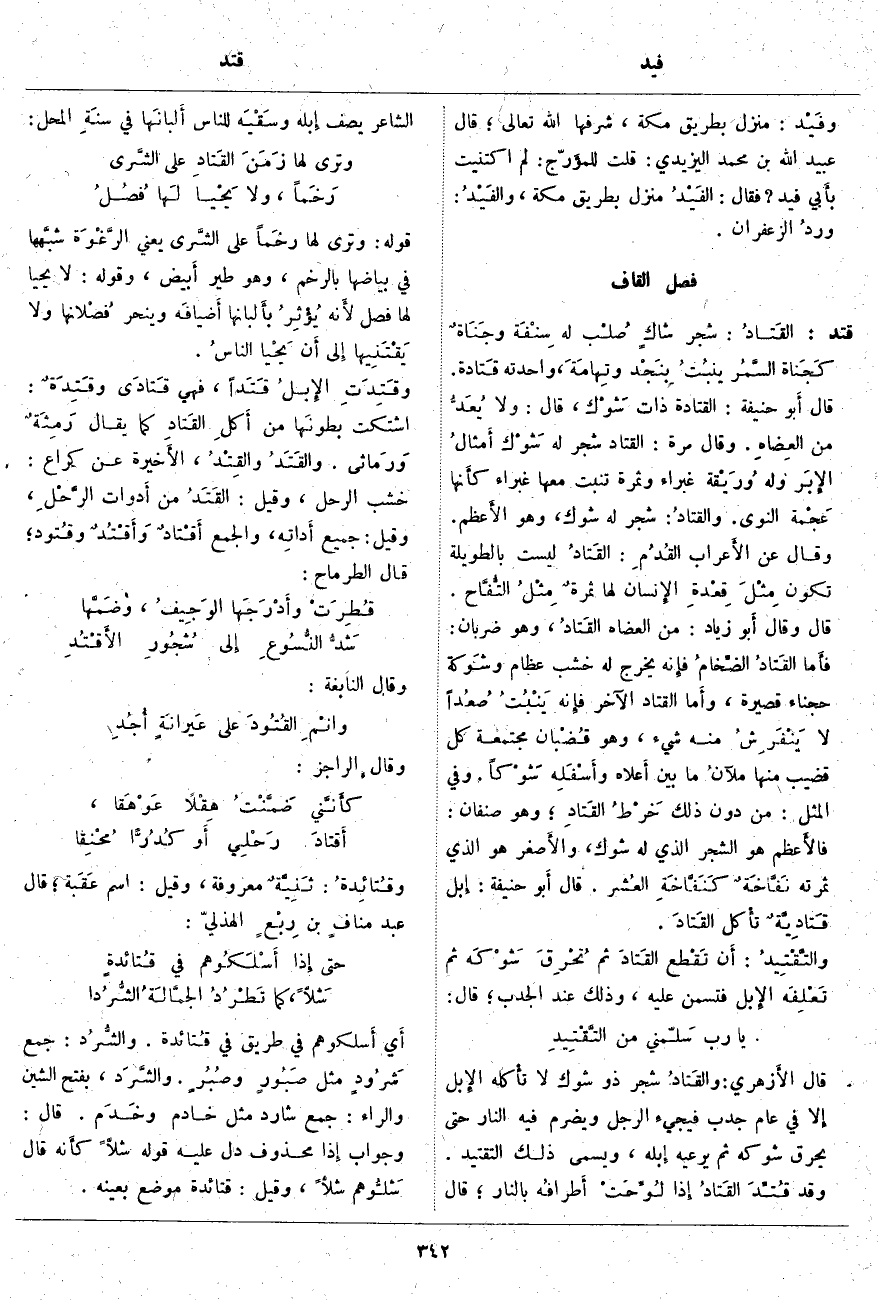 قتد: القَتادُ: شَجَرٌ شاكٍ صُلْب لَهُ سِنْفَة وجَنَاةٌ كَجَناة السَّمُر ينبُتُ بِنَجْد وتِهامَةَ، وَاحِدَتُهُ قَتادة. قَالَ أَبو حَنِيفَةَ: الْقَتَادَةُ ذَاتُ شَوْك، قَالَ: وَلَا يُعَدُّ مِنْ العِضاهِ. وَقَالَ مَرَّةً: الْقَتَادُ شَجَرٌ لَهُ شَوْك أَمثالُ الإِبَر وَلَهُ وُرَيْقة غَبْرَاءُ وَثَمَرَةٌ تَنْبُتُ مَعَهَا غَبْرَاءُ كأَنها عَجْمة النَّوَى. والقتادُ: شَجَرٌ لَهُ شَوْكٌ، وَهُوَ الأَعظم. وَقَالَ عَنِ الأَعراب القُدُمِ: القَتادُ لَيْسَتْ بِالطَّوِيلَةِ تَكُونَ مِثْلَ قِعْدةِ الإِنسان لَهَا ثمرةٌ مِثْلُ التُّفَّاح. قَالَ وَقَالَ أَبو زِيَادٍ: مِنَ الْعِضَاهِ القَتادُ، وَهُوَ ضَرْبَانِ: فأَما القَتادُ الضِّخامُ فإِنه يَخْرُجُ لَهُ خَشَبٌ عِظَامٌ وشَوكة حَجْنَاءُ قَصِيرَةٌ، وأَما الْقَتَادُ الْآخَرُ فإِنه يَنْبُتُ صُعُداً لَا يَنْفَرِشُ مِنْهُ شَيْءٌ، وَهُوَ قُضْبان مُجْتَمِعَةٌ كُلُّ قَضِيبٍ مِنْهَا ملآنُ مَا بينَ أَعلاه وأَسْفَلِه شَوْكاً. وَفِي الْمَثَلِ: مِنْ دُونَ ذَلِكَ خَرْطُ القَتادِ؛ وَهُوَ صِنْفَانِ: فالأَعظم هُوَ الشَّجَرُ الَّذِي لَهُ شَوْكٌ، والأَصغر هُوَ الَّذِي ثَمَرَتُهُ نَفَّاخَةٌ كَنَفَّاخَةِ العُشر. قَالَ أَبو حَنِيفَةَ: إِبل قَتادِيَّةٌ تأْكل القَتادَ. والتَّقْتِيدُ: أَن تَقْطع القَتادَ ثُمَّ تُحْرِقَ شَوْكَه ثُمَّ تَعْلِفَه الإِبل فَتَسْمَنَ عَلَيْهِ، وَذَلِكَ عِنْدَ الْجَدْبِ؛ قَالَ: