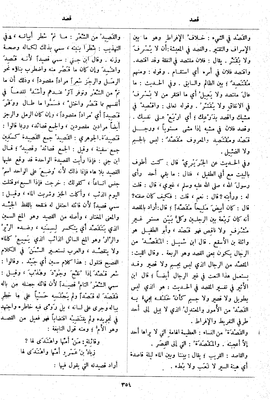 ؛ قَالَ: أَراد بِالْمُقَصَّدِ أَنه كَانَ رَبْعة بَيْنَ الرَّجُلَيْنِ وكلُّ بَيْن مستوٍ غيرِ مُشْرفٍ وَلَا ناقِص فَهُوَ قَصْد، وأَبو الطُّفَيْلِ هُوَ وَاثِلَةُ بْنُ الأَسقع. قَالَ ابْنُ شُمَيْلٍ: المُقَصَّدُ مِنَ الرِّجَالِ يَكُونُ بِمَعْنَى الْقَصْدِ وَهُوَ الرَّبْعَةُ. وَقَالَ اللَّيْثُ: المقصَّد مِنَ الرِّجَالِ الَّذِي لَيْسَ بِجَسِيمٍ وَلَا قَصِيرٍ وَقَدْ يُسْتَعْمَلُ هَذَا النَّعْتُ فِي غَيْرِ الرِّجَالِ أَيضاً؛ قَالَ ابْنُ الأَثير فِي تَفْسِيرِ الْمَقْصِدِ فِي الْحَدِيثِ: هُوَ الَّذِي لَيْسَ بِطَوِيلٍ وَلَا قَصِيرٍ وَلَا جَسِيمٍ كأَنَّ خَلْقه يجيءُ بِهِ القَصْدُ مِنَ الأُمور والمعتدِلُ الَّذِي لَا يَمِيلُ إِلى أَحد طَرَفَيِ التَّفْرِيطِ والإِفراط. والقَصْدَةُ مِنَ النِّسَاءِ: الْعَظِيمَةُ الهامةِ الَّتِي لَا يَرَاهَا أَحد إِلَّا أَعجبته. والمَقْصَدَةُ: الَّتِي إِلى القِصَر. وَالْقَاصِدُ: الْقَرِيبُ؛ يُقَالُ: بَيْنَنَا وَبَيْنَ الْمَاءِ لَيْلَةٌ قَاصِدَةٌ أَي هَيِّنَةُ السَّيْرِ لَا تَعَب وَلَا بُطء. والقَصِيدُ مِنَ الشِّعْر: مَا تمَّ شَطْرُ أَبياته، وَفِي التَّهْذِيبِ: شَطْرَا بِنْيَتِهِ، سُمِّيَ بِذَلِكَ لِكَمَالِهِ وَصِحَّةِ وَزْنِهِ. وَقَالَ ابْنُ جِنِّي: سُمِّيَ قَصِيدًا لأَنه قُصِدَ واعتُمِدَ وإِن كَانَ مَا قَصُر مِنْهُ وَاضْطَرَبَ بناؤُه نَحْوَ الرمَل والرجَز شِعْرًا مُرَادًا مَقْصُودًا، وَذَلِكَ أَن مَا تمَّ مِنَ الشِّعْر وَتَوَفَّرَ آثرُ عِنْدَهُمْ وأَشَدُّ تَقَدُّمًا فِي أَنفسهم مِمَّا قَصُر واختلَّ، فسَمُّوا مَا طَالَ ووَفَرَ قَصِيداً أَي مُراداً مَقْصُودًا، وإِن كَانَ الرَّمَلُ وَالرَّجَزُ أَيضاً مُرَادَيْنِ مَقْصُودَيْنِ، وَالْجَمْعُ قَصَائِدُ، وَرُبَّمَا قَالُوا: قَصِيدَة. الْجَوْهَرِيُّ: القَصِيدُ جَمْعُ القَصِيدة كسَفِين جَمْعُ سَفِينَةٍ، وَقِيلَ: الْجَمْعُ قصائدُ وقصِيدٌ؛ قَالَ ابْنُ جِنِّيٍّ: فإِذا رأَيت الْقَصِيدَةَ الْوَاحِدَةَ قَدْ وَقَعَ عَلَيْهَا الْقَصِيدُ بِلَا هَاءٍ فإِنما ذَلِكَ لأَنه وُضِعَ عَلَى الْوَاحِدِ اسمُ جِنْسٍ اتِّسَاعًا، كَقَوْلِكَ: خَرَجْتُ فإِذا السَّبُعُ، وَقَتَلْتُ الْيَوْمَ الذِّئْبَ، وأَكلت الْخُبْزَ وَشَرِبْتُ الْمَاءَ؛ وَقِيلَ: سُمِّيَ قَصِيدًا لأَن قَائِلَهُ احْتَفَلَ لَهُ فَنَقَّحَهُ بِاللَّفْظِ الجيِّد وَالْمَعْنَى الْمُخْتَارِ، وأَصله مِنَ الْقَصِيدِ وَهُوَ الْمُخُّ السَّمِينُ الَّذِي يَتَقَصَّد أَي يَتَكَسَّرُ لِسِمَنِه، وَضِدُّهُ الرِّيرُ والرَّارُ وَهُوَ الْمُخُّ السَّائِلُ الذَّائِبُ الَّذِي يَمِيعُ كَالْمَاءِ وَلَا يتقصَّد، وَالْعَرَبُ تَسْتَعِيرُ السِّمَنَ فِي الْكَلَامِ الْفَصِيحِ فَتَقُولُ: هَذَا كَلَامٌ سَمِينٌ أَي جَيِّد. وَقَالُوا: شِعْرٌ قُصِّدَ إِذا نُقِّحَ وجُوِّدَ وهُذِّبَ؛ وَقِيلَ: سُمِّيَ الشِّعْرُ التامُّ قَصِيدًا لأَن قَائِلَهُ جَعَلَهُ مِنْ بَالِهِ فَقَصَدَ لَهُ قَصْداً وَلَمْ يَحْتَسِه حَسْياً عَلَى مَا خَطَرَ بِبَالِهِ وَجَرَى عَلَى لِسَانِهِ، بَلْ رَوَّى فِيهِ خَاطِرَهُ وَاجْتَهَدَ فِي تَجْوِيدِهِ وَلَمْ يقتَضِبْه اقْتِضَابًا فَهُوَ فَعِيلٌ مِنَ الْقَصْدِ وَهُوَ الأَمُّ؛ وَمِنْهُ قَوْلُ النَّابِغَةِ: