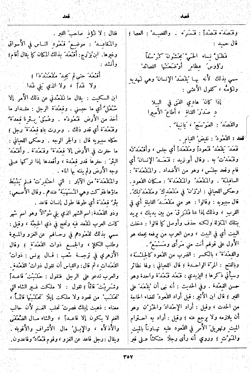 قعد: القُعُودُ: نقيضُ القيامِ. قَعَدَ يَقْعُدُ قُعوداً ومَقْعَداً أَي جَلَسَ، وأَقْعَدْتُه وقَعَدْتُ بِهِ. وَقَالَ أَبو زَيْدٍ: قَعَدَ الإِنسانُ أَي قَامَ وَقَعَدَ جلَس، وَهُوَ مِنَ الأَضداد. والمَقْعَدَةُ: السافِلَةُ. والمَقْعَدُ والمَقْعَدَةُ: مَكَانُ القُعودِ. وَحَكَى اللِّحْيَانِيُّ: ارْزُنْ فِي مَقْعَدِكَ ومَقْعَدَتِكَ. قَالَ سِيبَوَيْهِ: وَقَالُوا: هُوَ مِنِّي مَقْعَدَ القابلةِ أَي فِي القربِ، وَذَلِكَ إِذا دَنَا فَلَزِقَ مِنْ بَيْنِ يَدَيْكَ، يُرِيدُ بِتِلْكَ المَنَزلة وَلَكِنَّهُ حَذَفَ وأَوصل كَمَا قَالُوا: دَخَلْتُ الْبَيْتَ أَي فِي الْبَيْتِ، وَمِنَ الْعَرَبِ مَنْ يَرْفَعُهُ يَجْعَلُهُ هُوَ الأَول عَلَى قَوْلِهِمْ أَنت مِنِّي مَرأًى ومَسْمَعٌ. والقِعْدَةِ، بِالْكَسْرِ: الضَّرْبُ مِنَ القُعود كالجِلْسَة، وَبِالْفَتْحِ: الْمَرَّةُ الْوَاحِدَةُ؛ قَالَ اللِّحْيَانِيُّ: وَلَهَا نَظَائِرُ وسيأْتي ذِكْرُهَا؛ الْيَزِيدِيُّ: قَعَد قَعْدَة وَاحِدَةً وَهُوَ حَسَنُ القِعْدة. وَفِي الْحَدِيثِ: