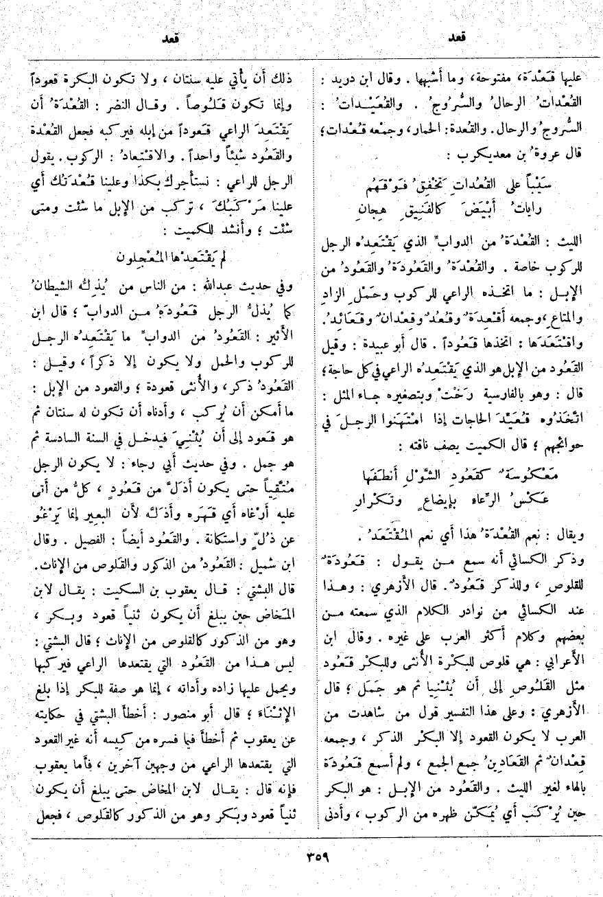 . وَيُقَالُ: نِعْمَ القُعْدَةُ هَذَا أَي نِعْمَ المُقْتَعَدُ. وَذَكَرَ الْكِسَائِيُّ أَنه سَمِعَ مَنْ يَقُولُ: قَعُودَةٌ للقلوصِ، وَلِلذَّكَرِ قَعُودٌ. قَالَ الأَزهري: وَهَذَا عِنْدَ الْكِسَائِيِّ مِنْ نَوَادِرِ الْكَلَامِ الَّذِي سَمِعْتُهُ مِنْ بَعْضِهِمْ وَكَلَامُ أَكثر الْعَرَبِ عَلَى غَيْرُهُ. وَقَالَ ابْنُ الأَعرابي: هِيَ قَلُوصٌ للبكْرة الأُنثى وللبكْر قَعُود مِثْلُ القَلُوصِ إِلى أَن يُثْنِيا ثُمَّ هُوَ جَمَل؛ قَالَ الأَزهري: وَعَلَى هَذَا التَّفْسِيرِ قَوْلُ مَنْ شَاهَدْتُ مِنَ الْعَرَبِ لَا يَكُونُ الْقَعُودُ إِلا البكْر الذَّكَرَ، وَجَمْعُهُ قِعْدانٌ ثُمَّ القَعَادِينُ جَمْعُ الْجَمْعِ، وَلَمْ أَسمع قَعُودَة بِالْهَاءِ لِغَيْرِ اللَّيْثِ. والقَعُود مِنَ الإِبل: هُوَ الْبَكْرُ حِينَ يُرْكَب أَي يُمَكّن ظَهْرُهُ مِنَ الرُّكُوبِ، وأَدنى ذَلِكَ أَن يأْتي عَلَيْهِ سَنَتَانِ، وَلَا تَكُونُ الْبَكْرَةُ قَعُودًا وإِنما تَكُونُ قَلُوصاً. وَقَالَ النَّضْرُ: القُعْدَةُ أَن يَقْتَعِدَ الرَّاعِي قَعوداً مِنْ إِبله فَيَرْكَبُهُ فَجَعَلَ القُعْدة والقَعُود شَيْئًا وَاحِدًا. والاقْتِعادُ: الرُّكُوبُ. يَقُولُ الرَّجُلُ لِلرَّاعِي: نستأْجرك بِكَذَا وَعَلَيْنَا قُعْدَتُك أَي عَلَيْنَا مَرْكَبُكَ، تَرْكَبُ مِنَ الإِبل مَا شِئْتَ وَمَتَى شِئْتَ؛ وأَنشد لِلْكُمَيْتِ: