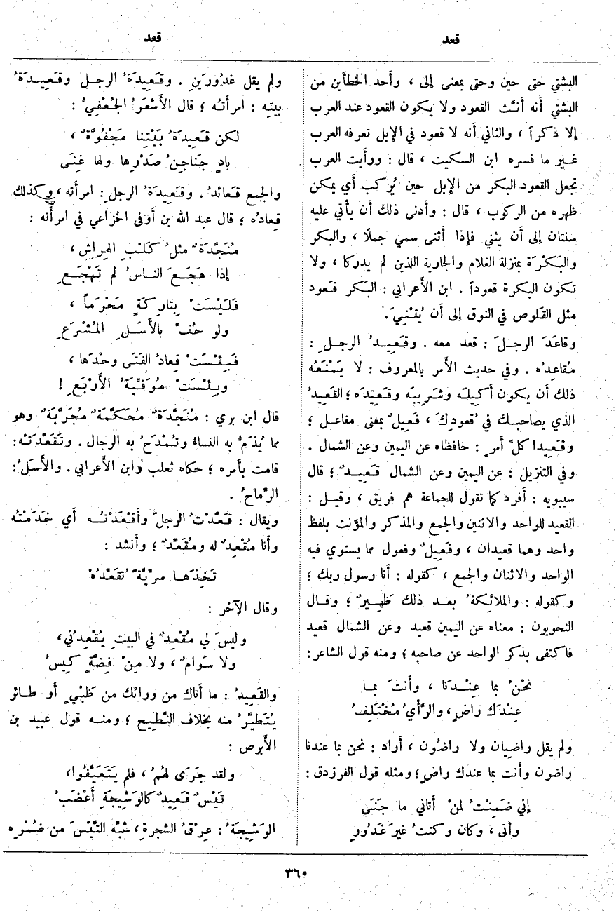 الْبُشْتِيُّ حَتَّى حِينَ وَحَتَّى بِمَعْنَى إِلى، وأَحد الخطأَين مِنَ الْبُشْتِيِّ أَنه أَنَّث الْقَعُودَ وَلَا يَكُونُ الْقَعُودُ عِنْدَ الْعَرَبِ إِلا ذَكَرًا، وَالثَّانِي أَنه لَا قَعُودَ فِي الإِبل تَعْرِفُهُ الْعَرَبُ غَيْرَ مَا فَسَّرَهُ ابْنُ السِّكِّيتِ، قَالَ: ورأَيت الْعَرَبَ تَجْعَلُ الْقَعُودَ الْبَكْرَ مِنَ الإِبل حِينَ يُركب أَي يُمَكَّنُ ظَهْرُهُ مِنَ الرُّكُوبِ، قَالَ: وأَدنى ذَلِكَ أَن يأْتي عَلَيْهِ سَنَتَانِ إِلى أَن يُثْنِيَ فإِذا أَثنى سُمِّيَ جَمَلًا، وَالْبَكْرُ والبَكْرَة بِمَنْزِلَةِ الْغُلَامِ وَالْجَارِيَةِ اللَّذَيْنِ لَمْ يُدْرِكَا، وَلَا تَكُونُ الْبَكْرَةَ قَعُودًا. ابْنُ الأَعرابي: البَكر قَعود مِثْلُ القَلوص فِي النُّوقِ إِلى أَن يُثْنِيَ. وقاعَدَ الرجلَ: قَعَدَ منه. وقَعِيدُ الرجلِ: مُقاعِدُه. وَفِي حَدِيثِ الأَمر بِالْمَعْرُوفِ: