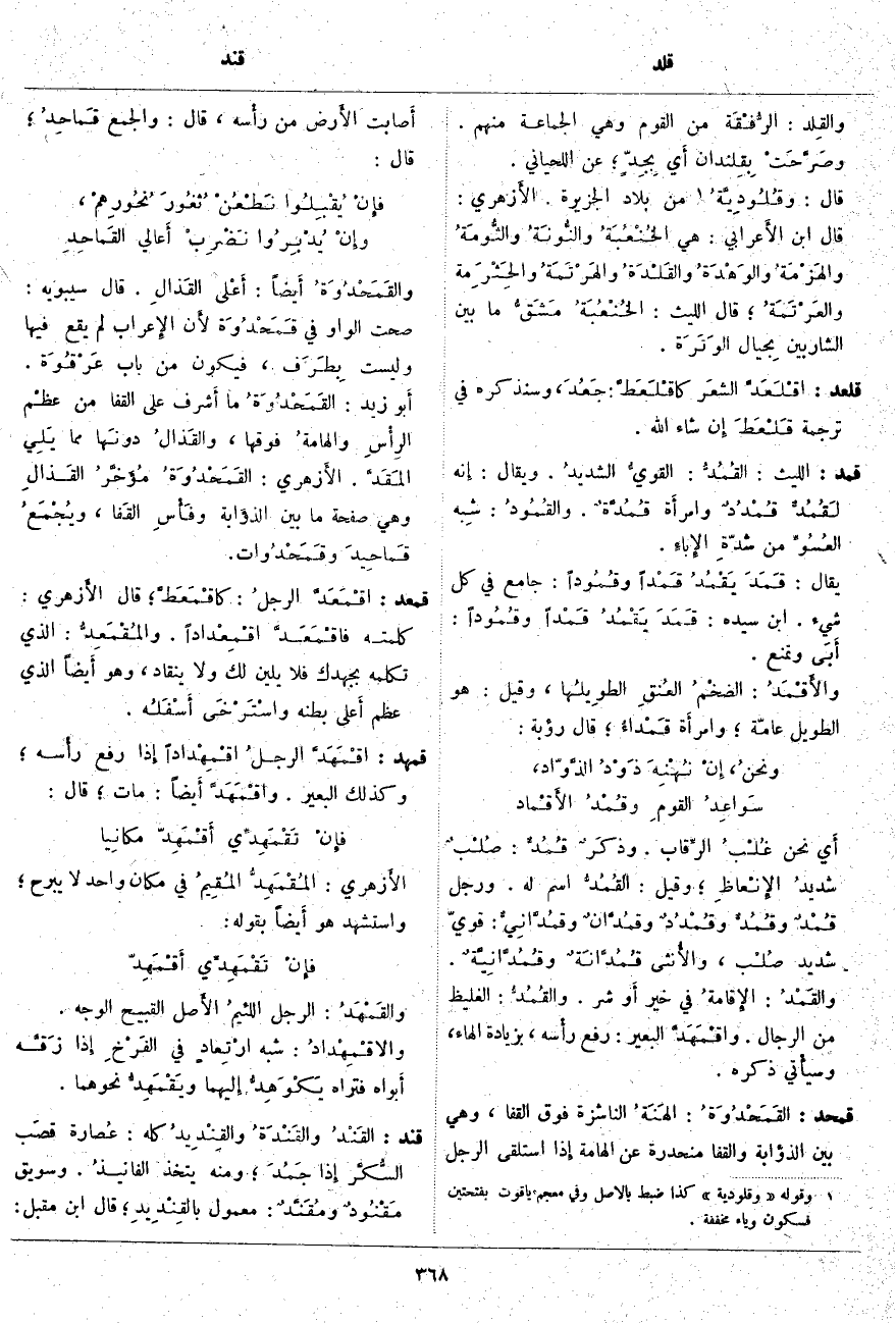 قمد: اللَّيْثُ: القُمُدُّ: القويُّ الشديدُ. وَيُقَالُ: إِنه لَقُمُدٌّ قُمْدُدٌ وامرأَة قُمُدَّةٌ. والقُمُودُ: شِبه العُسُوِّ مِنْ شدّةِ الإِباءِ. يُقَالُ: قَمَدَ يَقْمُدُ قَمْداً وقُمُوداً: جَامِعٌ فِي كُلَّ شَيْءٍ. ابْنُ سِيدَهْ: قَمَدَ يَقْمُدُ قَمْداً وقُمُوداً: أَبَى وَتَمَنَّعَ. والأَقْمَدُ: الضخْمُ العُنقِ الطوِيلُها، وَقِيلَ: هُوَ الطَّوِيلُ عَامَّةً؛ وامرأَة قَمْداءُ؛ قَالَ رُؤْبَةُ: