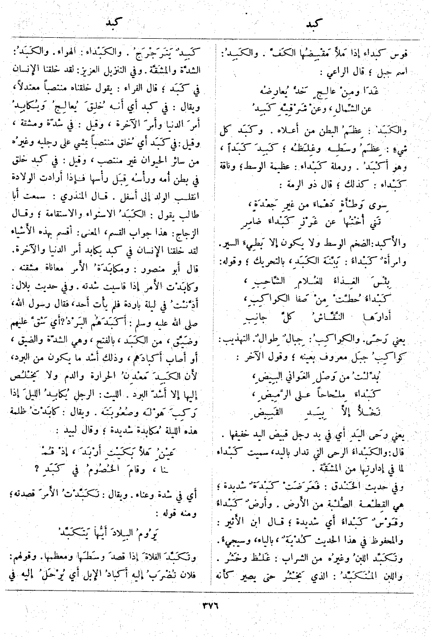 ؛ قَالَ الْفَرَّاءُ: يَقُولُ خَلَقْنَاهُ مُنْتَصِبًا مُعْتَدِلًا، وَيُقَالُ: فِي كَبَدٍ أَي أَنه خُلِقَ يُعالِجُ وَيُكابِدُ أَمرَ الدُّنْيَا وأَمرَ الْآخِرَةِ، وَقِيلَ: فِي شِدَّةٍ وَمَشَقَّةٍ، وَقِيلَ: فِي كَبَد أَي خُلق مُنْتَصِبًا يَمْشِي عَلَى رِجْلَيْهِ وغيرُه مِنْ سَائِرِ الْحَيَوَانِ غَيْرُ مُنْتَصِبٍ، وَقِيلَ: فِي كَبَدٍ خُلِقَ فِي بَطْنِ أُمه ورأْسُه قِبَل رأْسها فإِذا أَرادت الْوِلَادَةَ انْقَلَبَ الْوَلَدُ إِلى أَسفل. قَالَ الْمُنْذِرِيُّ: سَمِعْتُ أَبا طَالِبٍ يَقُولُ: الكَبَدُ الِاسْتِوَاءُ وَالِاسْتِقَامَةُ؛ وَقَالَ الزَّجَّاجُ: هَذَا جَوَابُ القسم، المعنى: أَقْسَمَ بِهَذِهِ الأَشياء لَقَدْ خَلَقْنَا الإِنسان فِي كَبَدٍ يُكَابِدُ أَمر الدُّنْيَا وَالْآخِرَةِ. قَالَ أَبو مَنْصُورٍ: ومكابَدَةُ الأَمر مُعَانَاةُ مَشَقَّتِهِ. وكابَدْت الأَمر إِذا قَاسَيْتُ شِدَّتَهُ. وَفِي حَدِيثِ