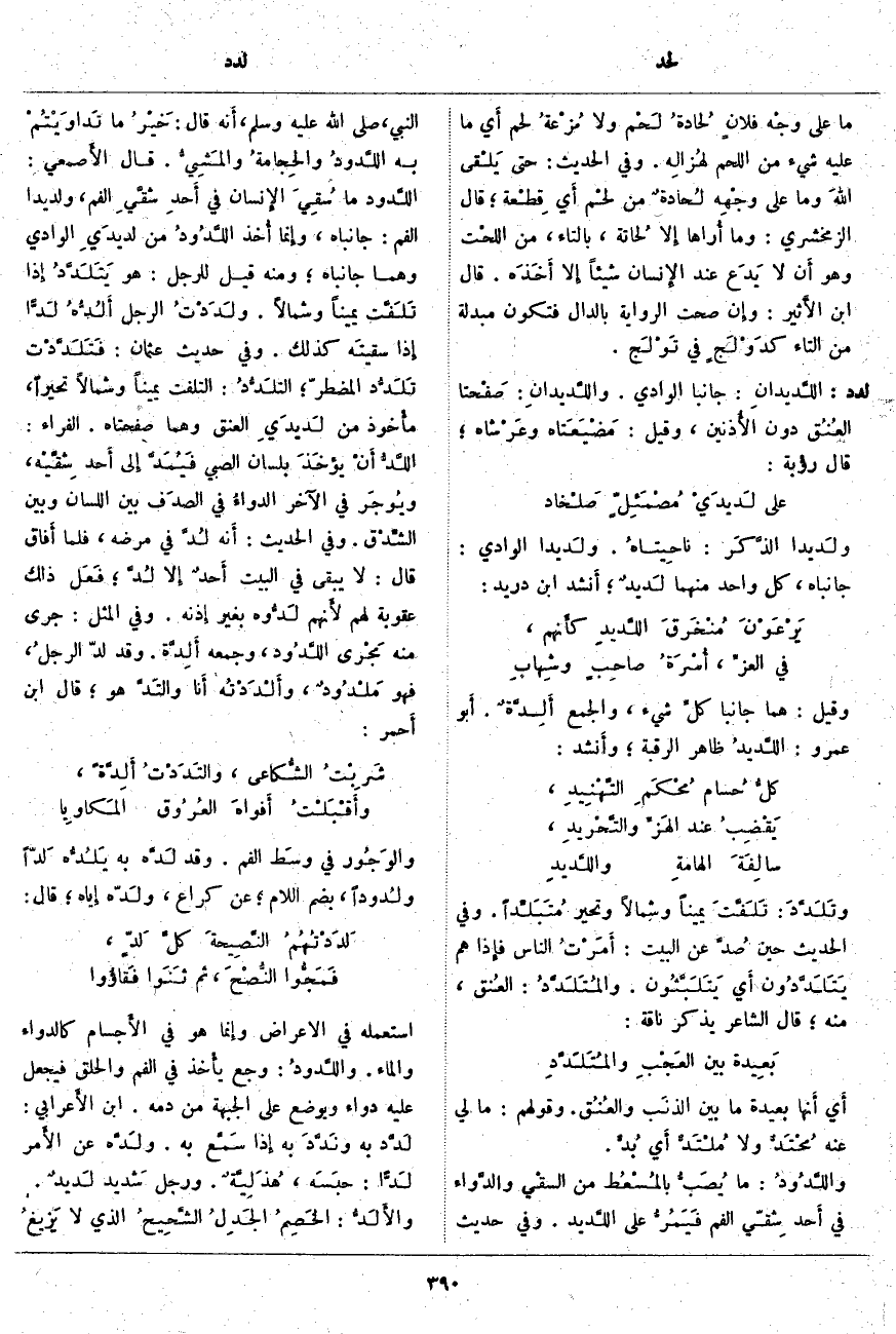 لدد: اللَّديدانِ: جَانِبَا الْوَادِي. واللَّديدانِ: صَفْحتا العُنُق دُونَ الأُذنين، وَقِيلَ: مَضْيَعَتاه وعَرْشاه؛ قَالَ رؤْبة: