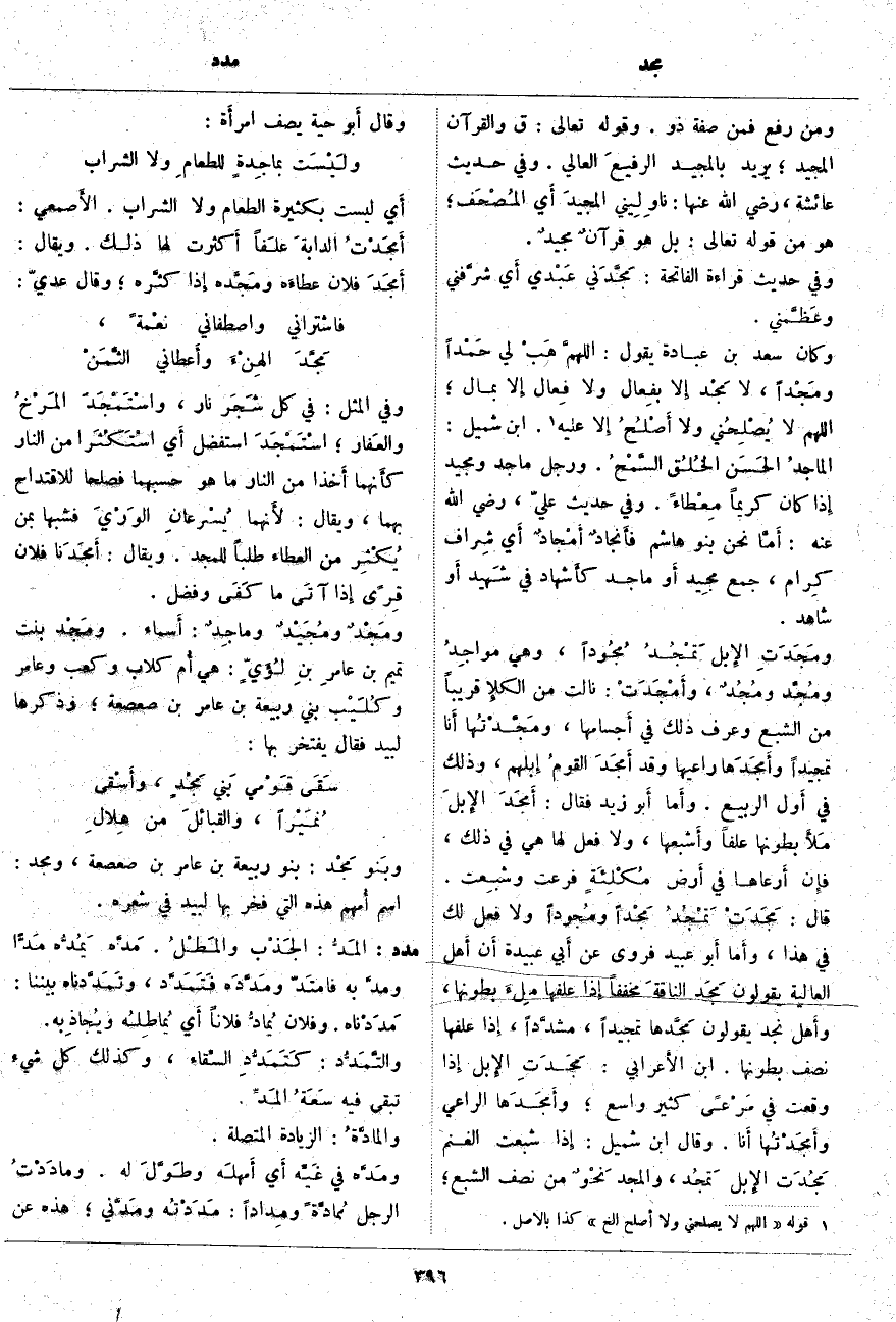 أَي شِراف كِرام، جَمْعُ مجِيد أَو مَاجِدٍ كأَشهاد فِي شَهيد أَو شَاهِدٍ. ومَجَدَتِ الإِبل تَمْجُدُ مُجُوداً، وَهِيَ مواجِدُ ومُجَّد ومُجُدٌ، وأَمْجَدَتْ: نَالَتْ مِنَ الكلإِ قَرِيبًا مِنَ الشَّبَعِ وَعُرِفَ ذَلِكَ فِي أَجسامها، ومَجَّدْتُها أَنا تَمْجِيدًا وأَمجَدَها رَاعِيهَا وَقَدْ أَمجَدَ القومُ إِبلهم، وَذَلِكَ فِي أَول الرَّبِيعِ. وأَما أَبو زَيْدٍ فَقَالَ: أَمجَدَ الإِبلَ مَلأَ بُطُونَهَا عَلَفًا وأَشبعها، وَلَا فِعْلَ لَهَا هِيَ فِي ذَلِكَ، فإِن أَرعاها فِي أَرض مُكْلِئَةٍ فَرَعَتْ وشبِعت. قَالَ: مَجَدَتْ تَمْجُدُ مَجْداً ومُجوداً وَلَا فِعْلَ لَكَ فِي هَذَا، وأَما أَبو عُبَيْدٍ فَرَوَى عَنْ أَبي عُبَيْدَةَ أَن أَهل الْعَالِيَةِ يَقُولُونَ مَجَد الناقةَ مُخَفَّفًا إِذا عَلَفَهَا مِلءَ بُطُونِهَا، وأَهل نَجْدٍ يَقُولُونَ مَجَّدها تَمْجِيدًا، مشدَّداً، إِذا عَلَفَهَا نِصْفَ بُطُونِهَا. ابْنُ الأَعرابي: مَجَدَتِ الإِبل إِذا وَقَعَتْ فِي مَرْعًى كَثِيرٍ وَاسِعٍ؛ وأَمجَدَها الرَّاعِي وأَمجَدْتُها أَنا. وَقَالَ ابْنُ شُمَيْلٍ: إِذا شَبِعَتِ الْغَنَمُ مَجُدَت الإِبل تَمجُد، وَالْمَجْدُ نَحْوٌ مِنْ نِصْفِ الشَّبَعِ؛ وَقَالَ أَبو حَيَّةَ يَصِفُ امرأَة:
