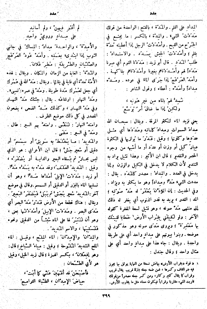والأَمِدّةُ، والواحدةُ مِدادٌ: المِساكُ فِي جَانِبَيِ الثوبِ إِذا ابْتدِئَ بعَملِه. وأَمَدَّ عُودُ العَرْفَجِ والصِّلِّيانِ والطَّرِيفَةِ: مُطِرَ فَلانَ. والمُدَّةُ: الْغَايَةُ مِنَ الزَّمَانِ وَالْمَكَانِ. وَيُقَالُ: لِهَذِهِ الأُمّةُ مُدَّة أَي غَايَةٌ فِي بَقَائِهَا. وَيُقَالُ: مَدَّ اللَّهُ فِي عُمُرك أَي جَعَلَ لعُمُرك مُدة طَوِيلَةً. ومُدَّ فِي عُمُرِهِ: نُسِئَ. ومَدُّ النهارِ: ارتفاعُه. يُقَالُ: جِئْتُكَ مَدَّ النَّهَارِ وَفِي مَدِّ النَّهَارِ، وَكَذَلِكَ مَدَّ الضُّحَى، يَضَعُونَ الْمَصْدَرَ فِي كُلِّ ذَلِكَ مَوْضِعَ الظَّرْفِ. وامتدَّ النهارُ: تَنَفَّس. وامتدَّ بِهِمُ السَّيْرُ: طَالَ. ومَدَّ فِي السَّيْرِ: مَضَى. والمَدِيدُ: مَا يُخْلَطُ بِهِ سَوِيقٌ أَو سِمْسمٌ أَو دَقِيقٌ أَو شَعِيرٌ جَشٌّ؛ قَالَ ابْنُ الأَعرابي: هُوَ الَّذِي لَيْسَ بحارٍّ ثُمَّ يُسقاه الْبَعِيرُ وَالدَّابَّةُ أَو يُضْفَرُه، وَقِيلَ: المَدِيدُ العَلَفُ، وَقَدْ مَدَّه بِهِ يَمُدُّه مَدًّا. أَبو زَيْدٍ: مَدَدْتُ الإِبلَ أَمُدُّها مَدًّا، وَهُوَ أَن تَسْقِيَهَا الْمَاءَ بِالْبِزْرِ أَو الدَّقِيقِ أَو السِّمْسِمِ. وَقَالَ فِي مَوْضِعٍ آخَرَ: المَدِيدُ شَعِيرٌ يُجَشُّ ثُمَّ يُبَلُّ فَيُضْفَرُ البَعِيرَ. وَيُقَالُ: هُنَاكَ قِطْعَةٌ مِنَ الأَرض قَدْرُ مَدِّ الْبَصَرِ أَي مَدَى الْبَصَرِ. ومَدَدْتُ الإِبِلَ وأَمْدَدْتُها بِمَعْنًى، وهو أَن تَنْثِرَ [تَنْثُرَ] لَهَا عَلَى الماءِ شَيْئًا مِنَ الدَّقِيقِ وَنَحْوِهِ فَتَسْقِيَها، وَالِاسْمُ المَدِيدُ. والمِدّانُ والإِمِدّانُ: الْمَاءُ المِلْح، وَقِيلَ: الْمَاءُ الْمِلْحُ الشديدُ المُلُوحة؛ وَقِيلَ: مِياهُ السِّباخِ؛ قَالَ: وَهُوَ إِفِعْلانٌ. بِكَسْرِ الْهَمْزَةِ؛ قَالَ زَيْدُ الْخَيْلِ، وَقِيلَ هُوَ لأَبي الطَّمَحان: