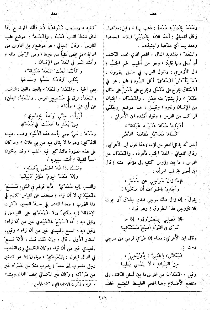 أَخبر أَنه يُقَاتِلُ الدَّهْرَ مِنْ لؤْمه؛ هَذَا قَوْلُ ابْنِ الأَعرابي. وَقَالَ اللِّحْيَانِيُّ: الْمَعَدُّ الْجَنْبُ فأَفرده. والمَعَدّان مِنَ الْفَرَسِ: مَا بَيْنَ رؤُوس كَتِفَيْهِ إِلى مؤَخر مَتْنِهِ؛ قَالَ ابْنُ أَحمر يُخَاطِبُ امرأَته: