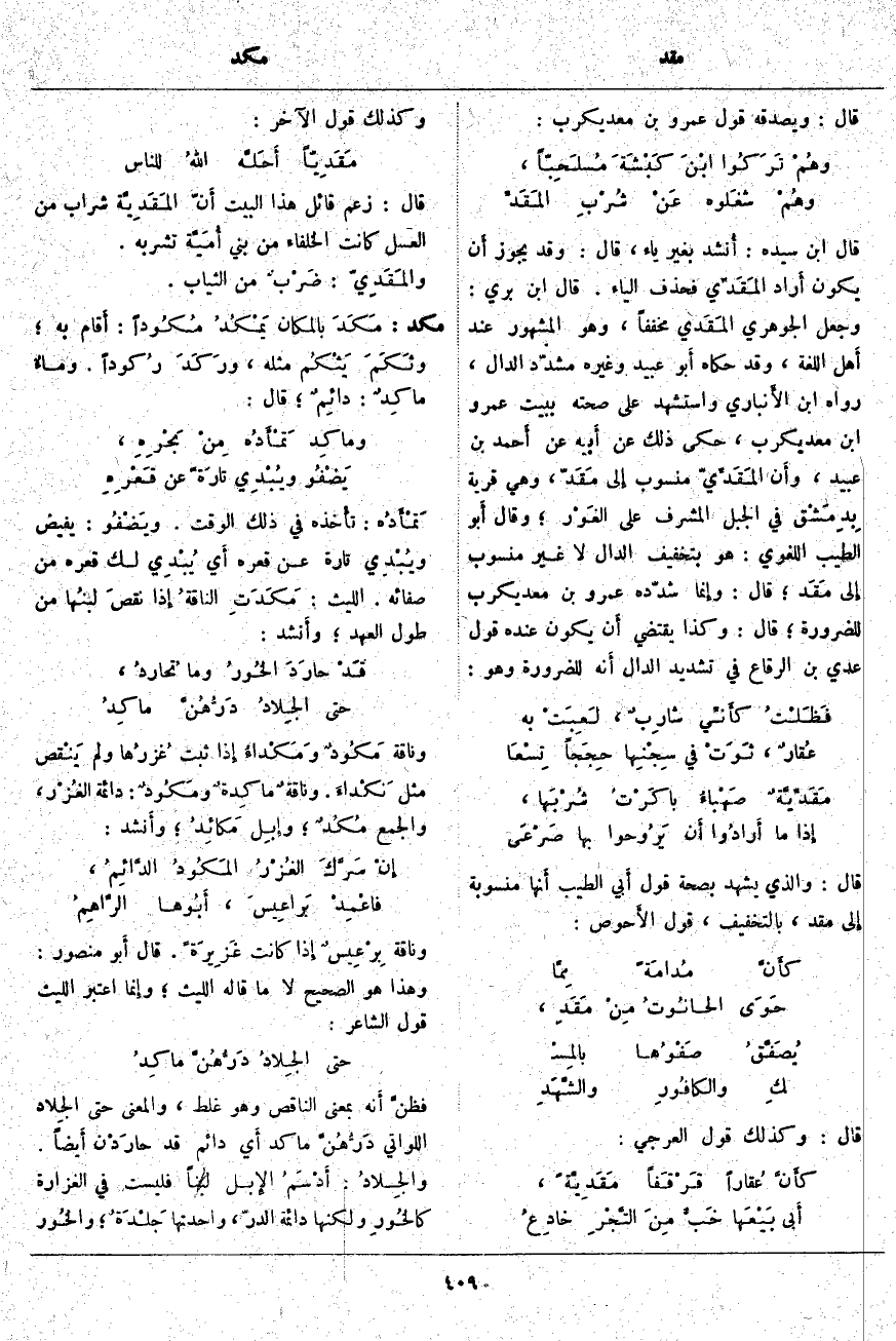 قَالَ ابْنُ سِيدَهْ: أُنشد بِغَيْرِ يَاءٍ، قَالَ: وَقَدْ يَجُوزُ أَن يَكُونَ أَراد المَقَدّي فَحَذَفَ الْيَاءِ. قَالَ ابْنُ بَرِّيٍّ: وَجَعَلَ الْجَوْهَرِيُّ المَقَدي مُخَفَّفًا، وَهُوَ الْمَشْهُورُ عِنْدَ أَهل اللُّغَةِ، وَقَدْ حَكَاهُ أَبو عُبَيْدٍ وَغَيْرُهُ مُشَدَّدَ الدَّالِ، رَوَاهُ ابْنُ الأَنباري وَاسْتَشْهَدَ عَلَى صِحَّتِهِ بِبَيْتِ عَمْرِو بْنِ مَعْدِيكَرِبَ، حَكَى ذَلِكَ عَنْ أَبيه عَنْ أَحمد بْنِ عُبَيْدِ، وأَن المَقَدِّيّ مَنْسُوبٌ إِلى مَقَدّ، وَهِيَ قَرْيَةٌ بِدِمَشْق فِي الْجَبَلِ الْمُشْرِفِ عَلَى الغَوْر؛ وَقَالَ أَبو الطَّيِّبِ اللُّغَوِيُّ: هُوَ بِتَخْفِيفِ الدَّالِ لَا غَيْرُ مَنْسُوبٌ إِلى مَقَد؛ قَالَ: وإِنما شَدَّدَهُ عَمْرُو بْنُ مَعْدِيكَرِبَ لِلضَّرُورَةِ؛ قَالَ: وَكَذَا يَقْتَضِي أَن يَكُونَ عِنْدَهُ قَوْلُ عَدِيِّ بْنِ الرِّقَاعِ فِي تَشْدِيدِ الدَّالِ أَنه لِلضَّرُورَةِ وَهُوَ: