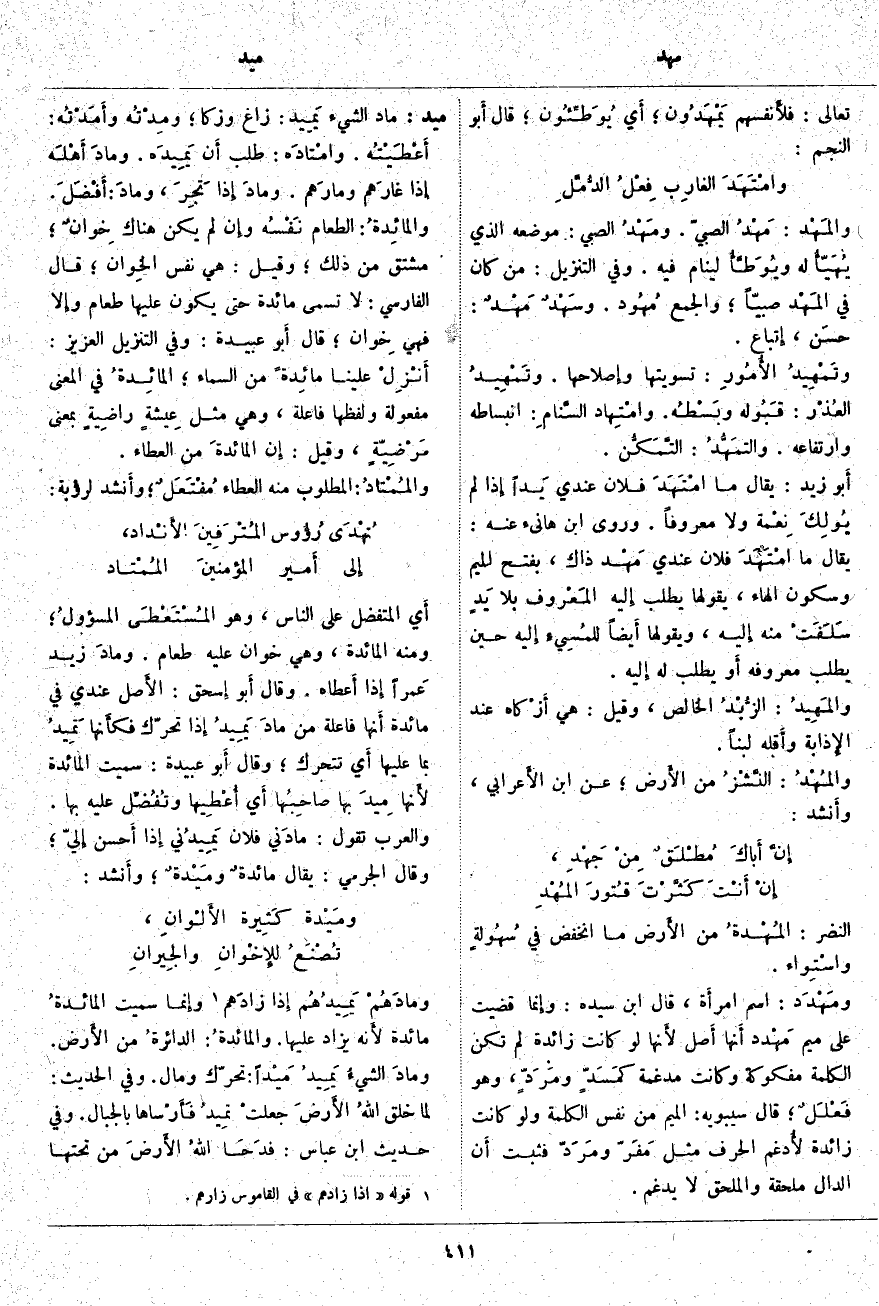 ميد: مَادَ الشَّيْءُ يَميد: زَاغَ وَزَكَا؛ ومِدْتُه وأَمَدْتُه: أَعْطَيْتُه. وامْتَادَه: طَلَبَ أَن يَمِيدَه. ومادَ أَهْلَه إِذَا غارَهم ومارَهم. ومادَ إِذا تَجِرَ، ومادَ: أَفْضَلَ. والمائِدةُ: الطَّعَامُ نَفْسُه وإِن لَمْ يَكُنْ هُنَاكَ خِوانٌ؛ مُشْتَقٌّ مِنْ ذَلِكَ؛ وَقِيلَ: هِيَ نَفْسُ الخِوان؛ قَالَ الْفَارِسِيُّ: لَا تُسَمَّى مَائِدَةً حَتَّى يَكُونَ عَلَيْهَا طَعَامٌ وإِلا فَهِيَ خِوان؛ قَالَ أَبو عُبَيْدَةَ: وَفِي التَّنْزِيلِ الْعَزِيزِ: أَنْزِلْ عَلَيْنا مائِدَةً مِنَ السَّماءِ