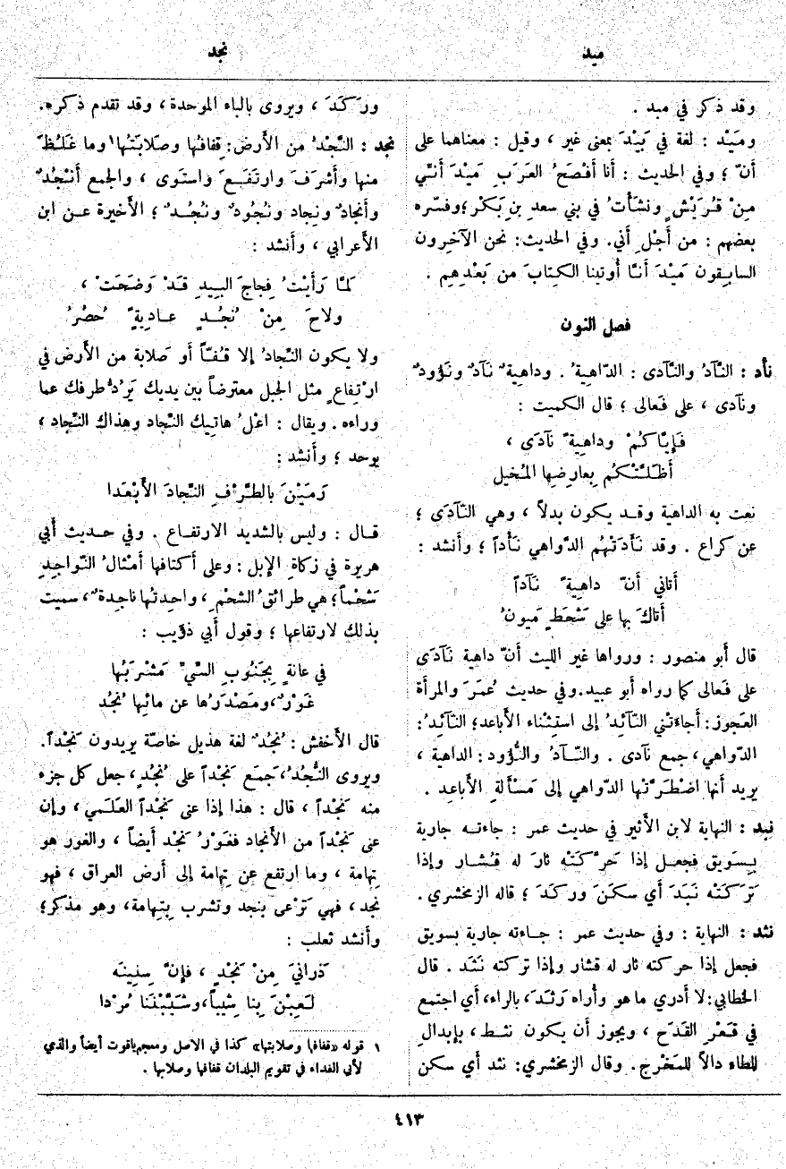 نجد: النَّجْدُ مِنَ الأَرض: قِفافُها وصَلَابَتُها «1» وَمَا غَلُظَ مِنْهَا وأَشرَفَ وارتَفَعَ واستَوى، وَالْجَمْعُ أَنْجُدٌ وأَنجادٌ ونِجاد ونُجُودٌ ونُجُدٌ؛ الأَخيرة عَنِ ابْنِ الأَعرابي، وأَنشد: